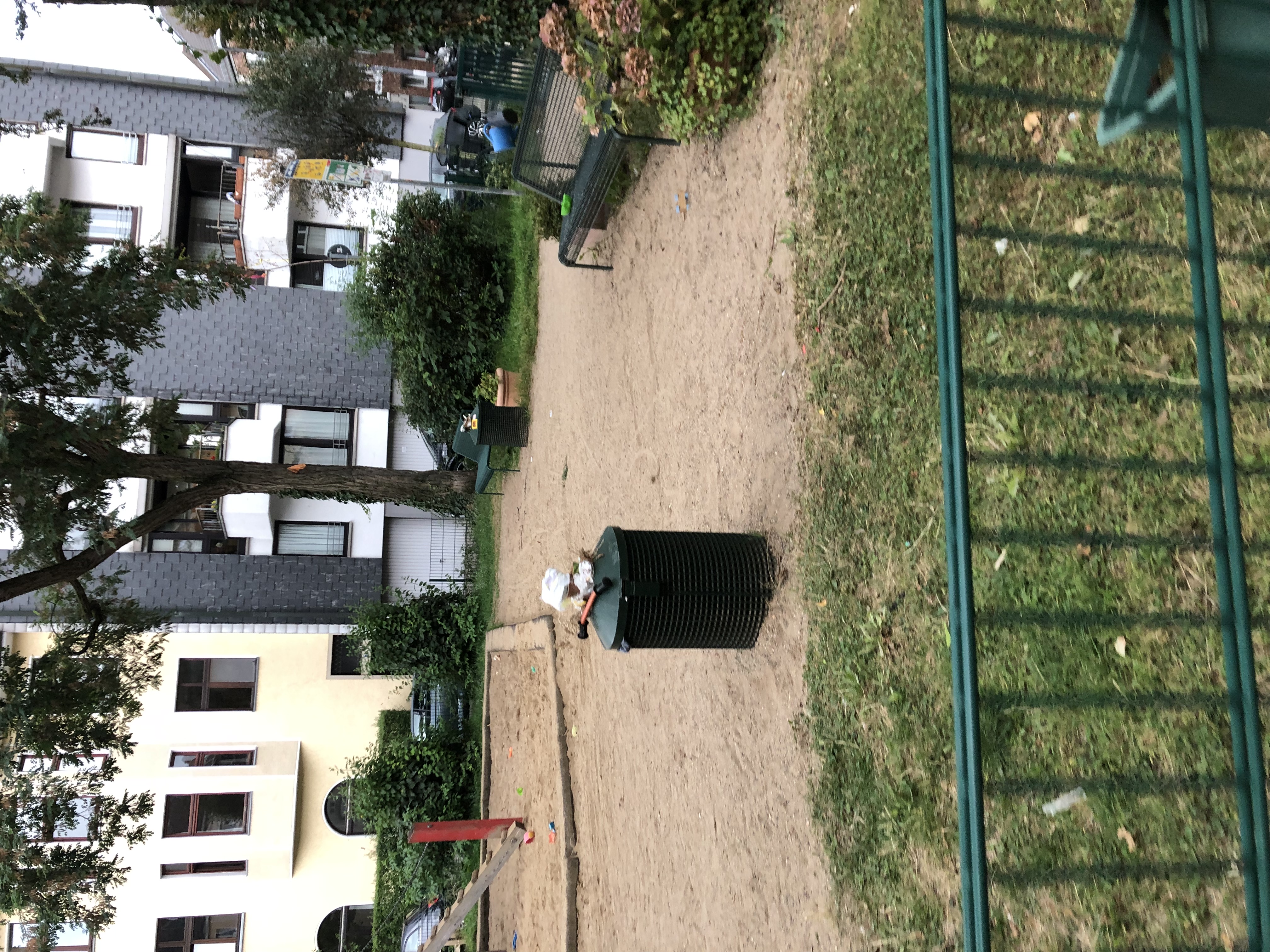 Auf dem Spielplatz sind die Mülltonnen voll’und jemand hat einem kaputten Dreirad reingetan.