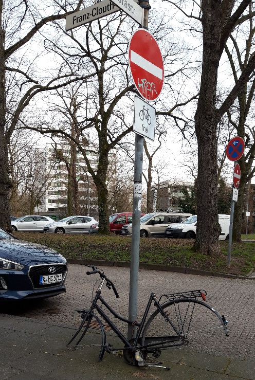 An der Ecke Franz- clouth str zur florastr ein schrottreifes Fahrrad schwarz seit längerem ..