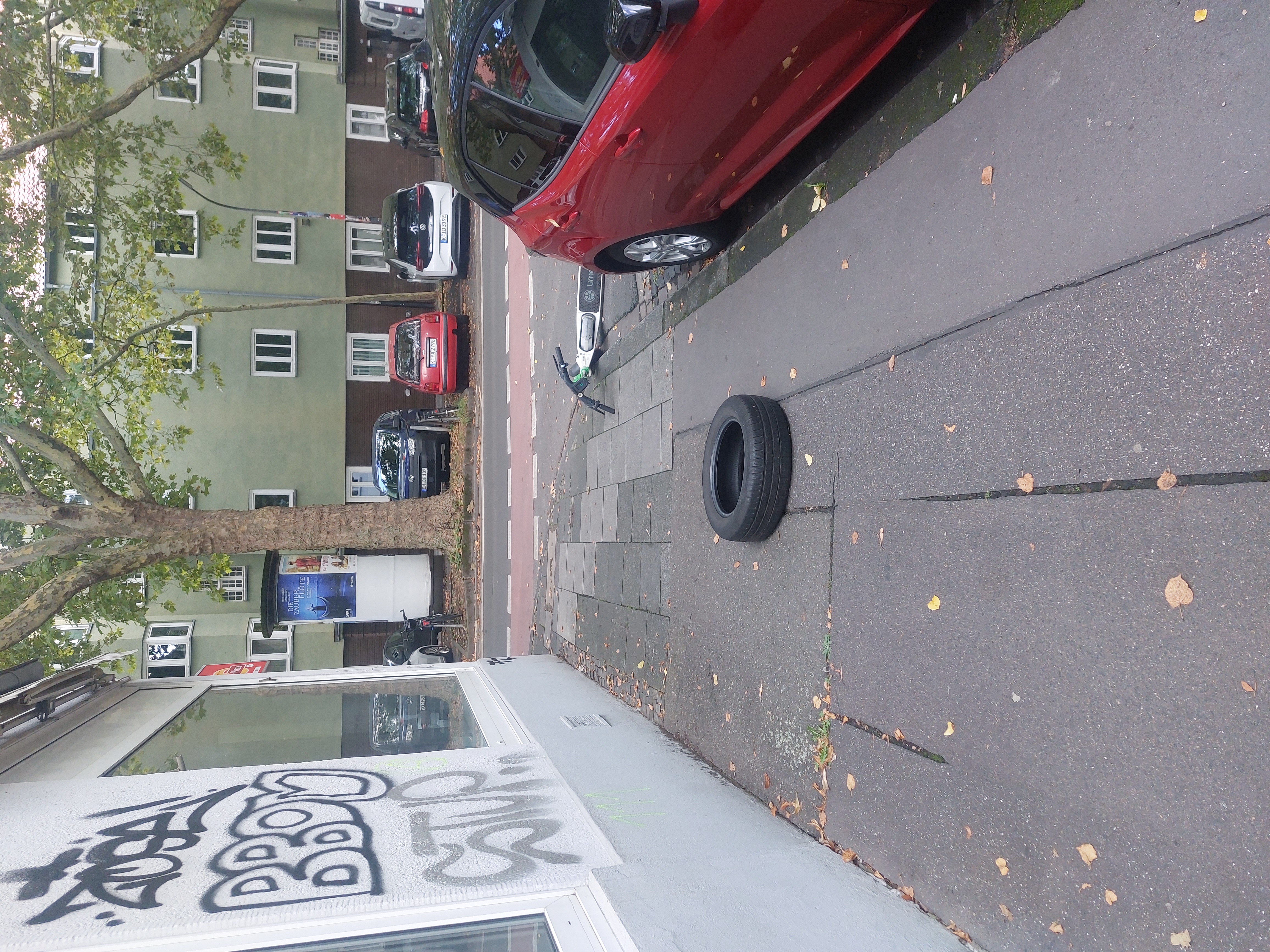 Vor dem Haus Vorgebirgsplatz 2 liegt ein Autoreifen auf dem Bürgersteig