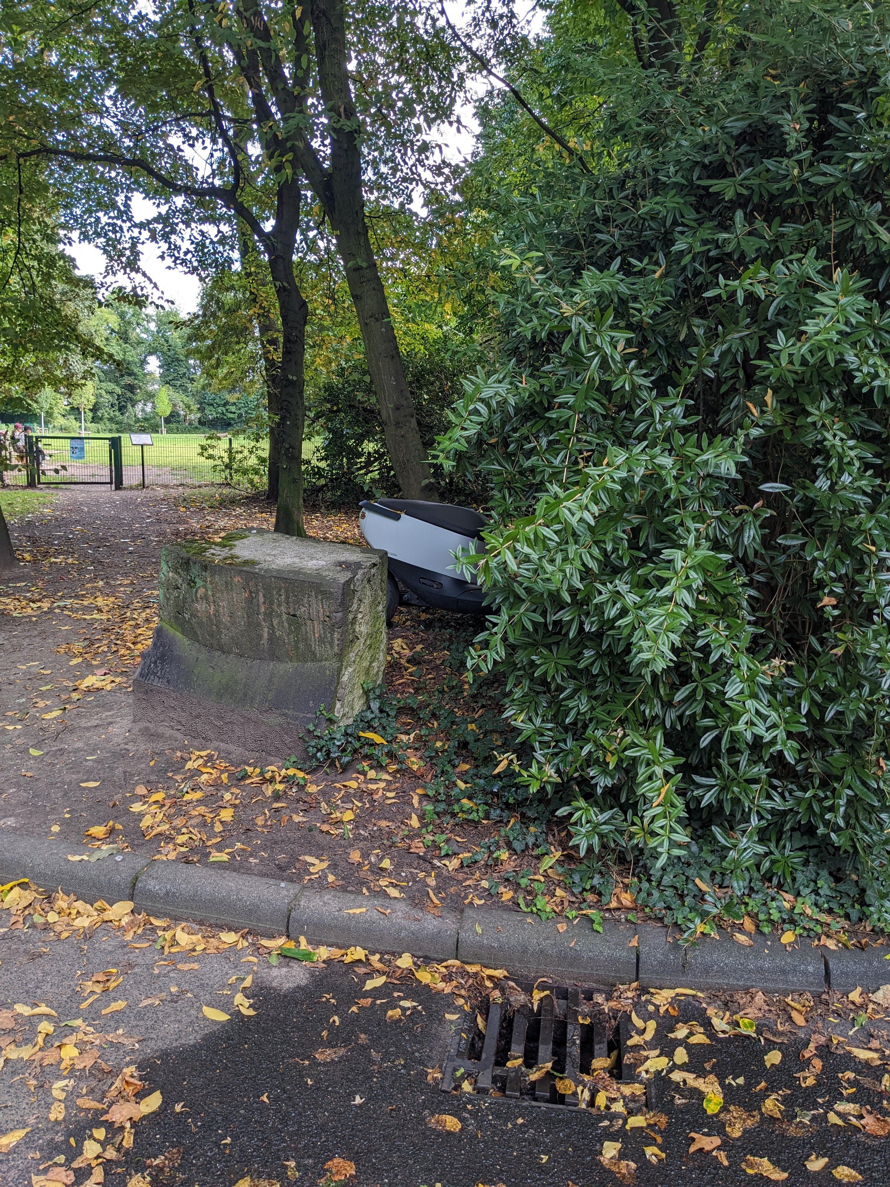Ein Schrott Motorroller im Gebüsch am Parkplatz