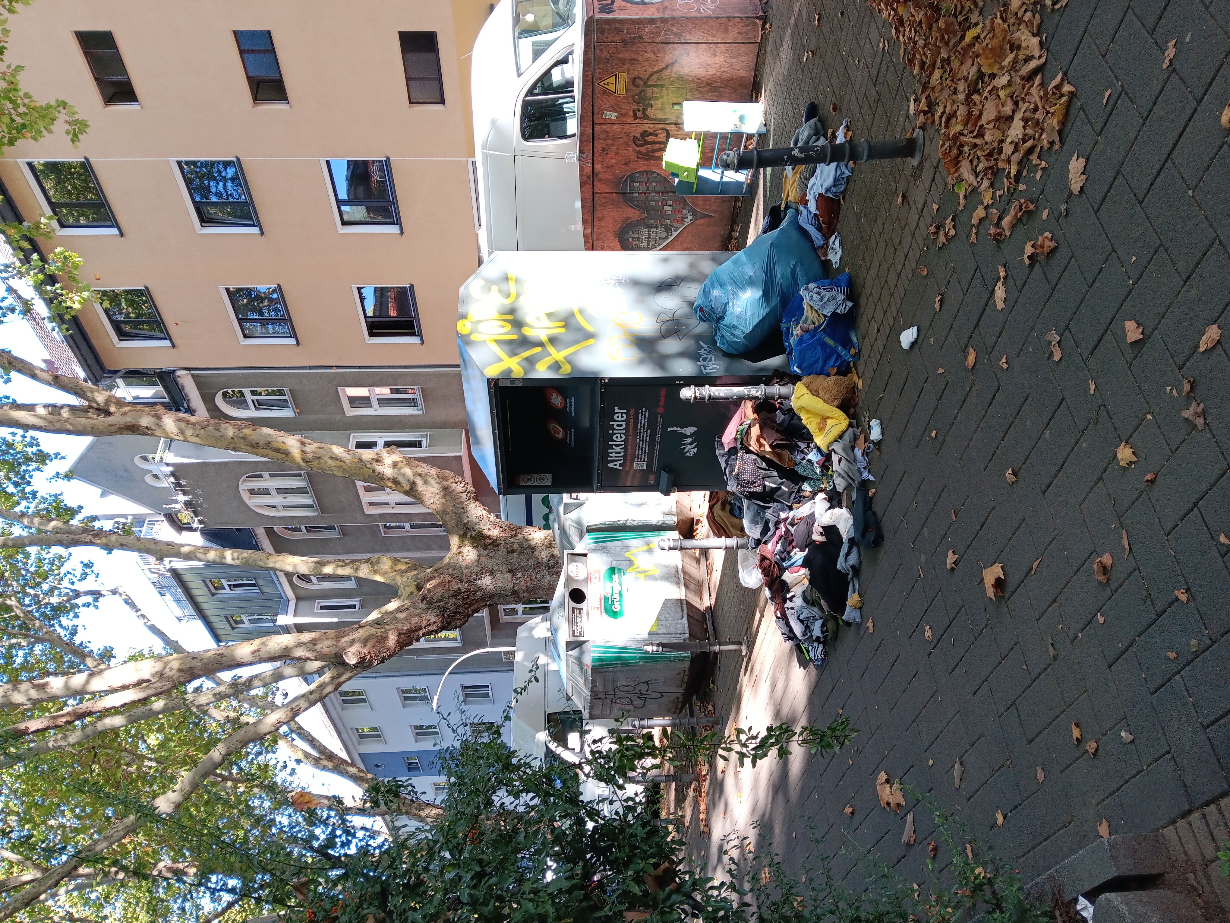 seit Wochen liegen Klamotten vor, neben und rundherum des Altkleidercontainers.