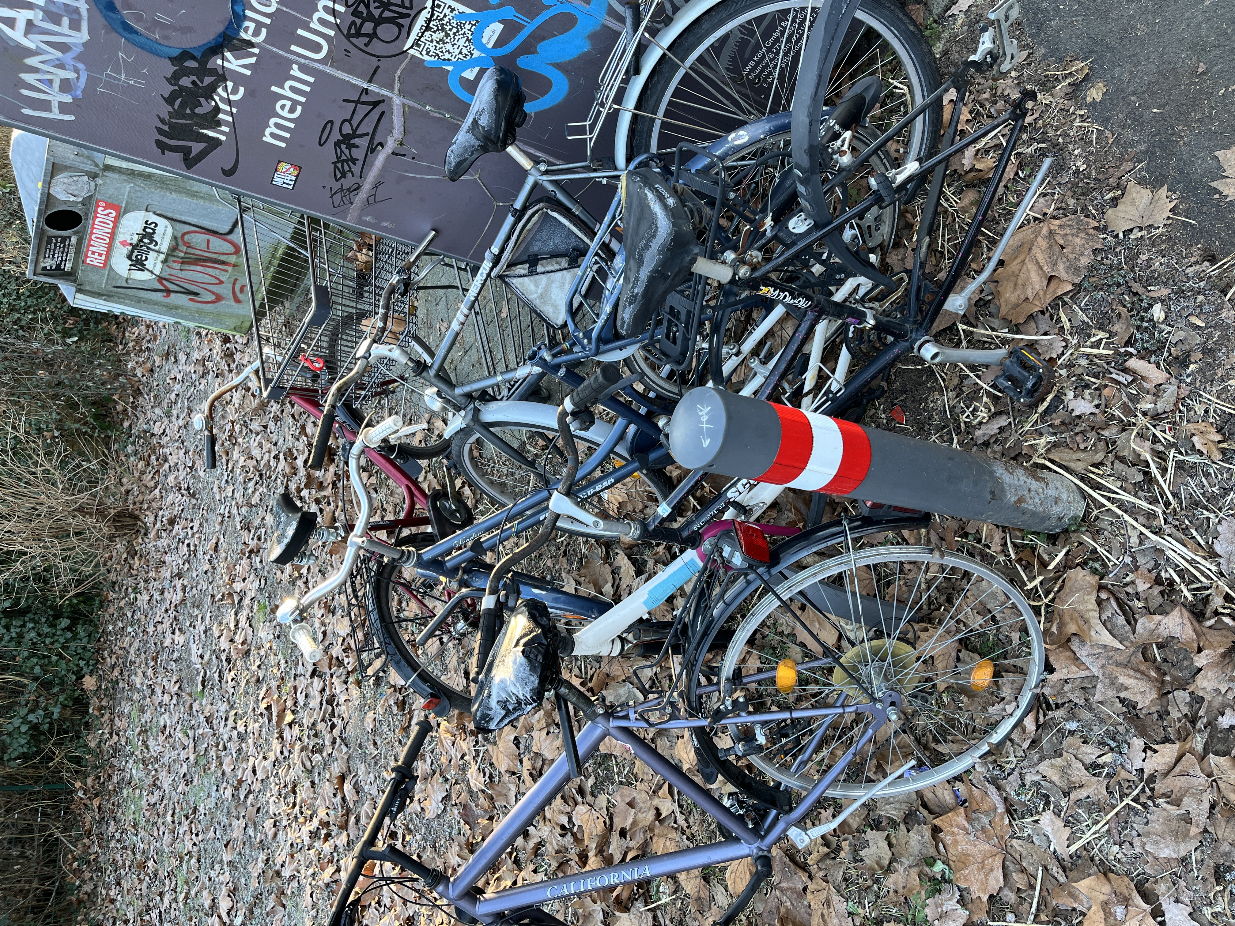 Auf dem Parkplatz Kirchenhof, Müngersdorf neben dem Altkleidercontainer befinden sich fünf Schrottfahrräder. In Bearbeitung Schrottfahrräder Kirchenhof 4 50933 Köln Deutschland Statusvermerke Das Anliegen wurde erstellt. Neu Mo., 05.01.2026 - 11:52
