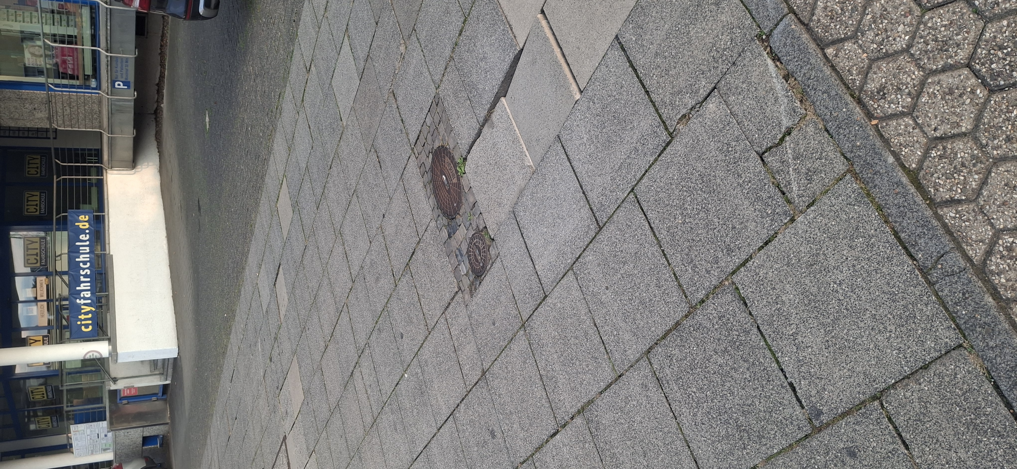 Abgesackte Gehwegplatte am Hydrant vor der Apotheke