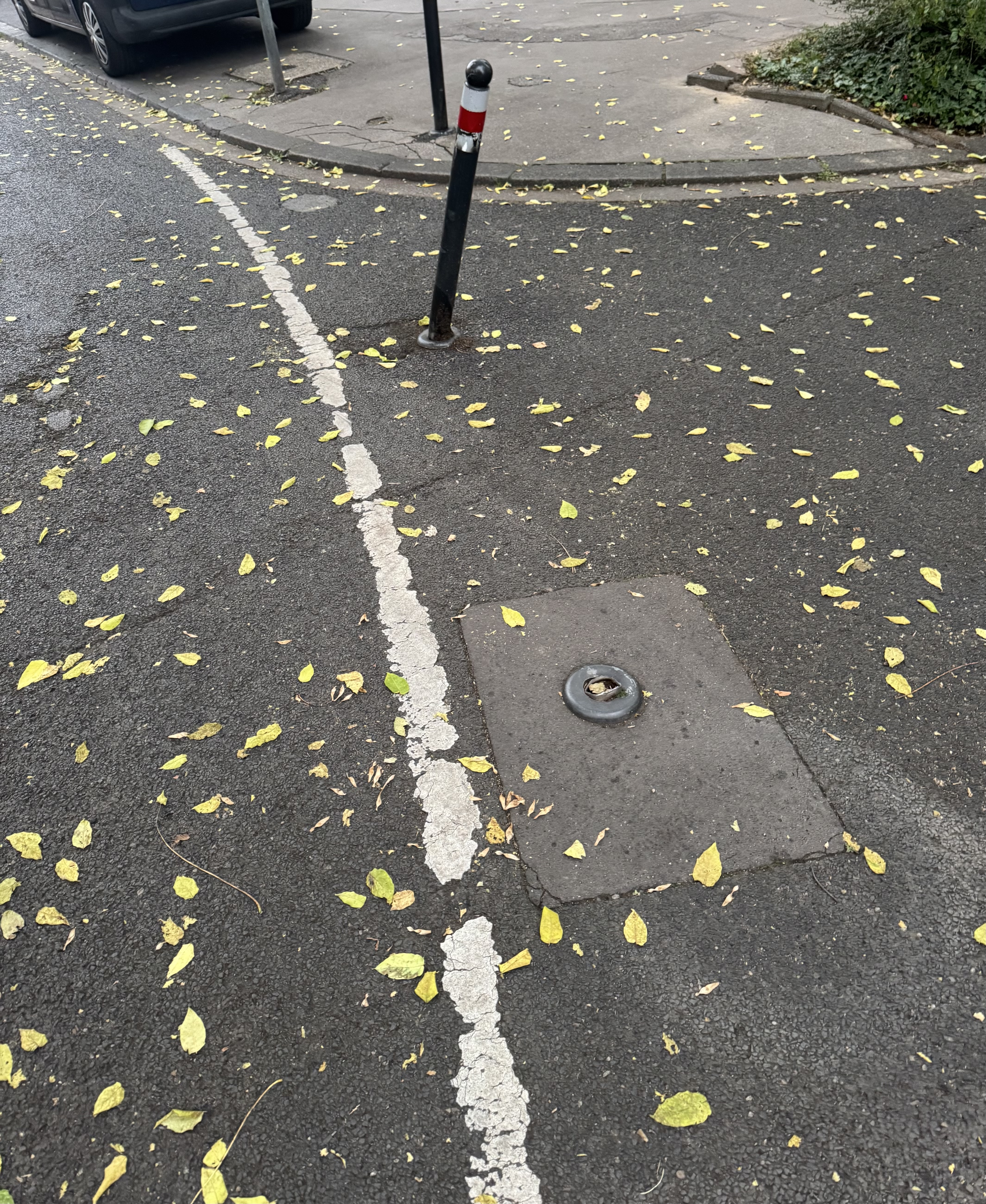 An der Diagonalsperre Eichendorffstraße/ Siemensstraße wurde ein Poller abgefahren. Die Reste am Boden sind sehr scharfkantig und stellen eine erhebliche Unfall- und Verletzungsgefahr dar.