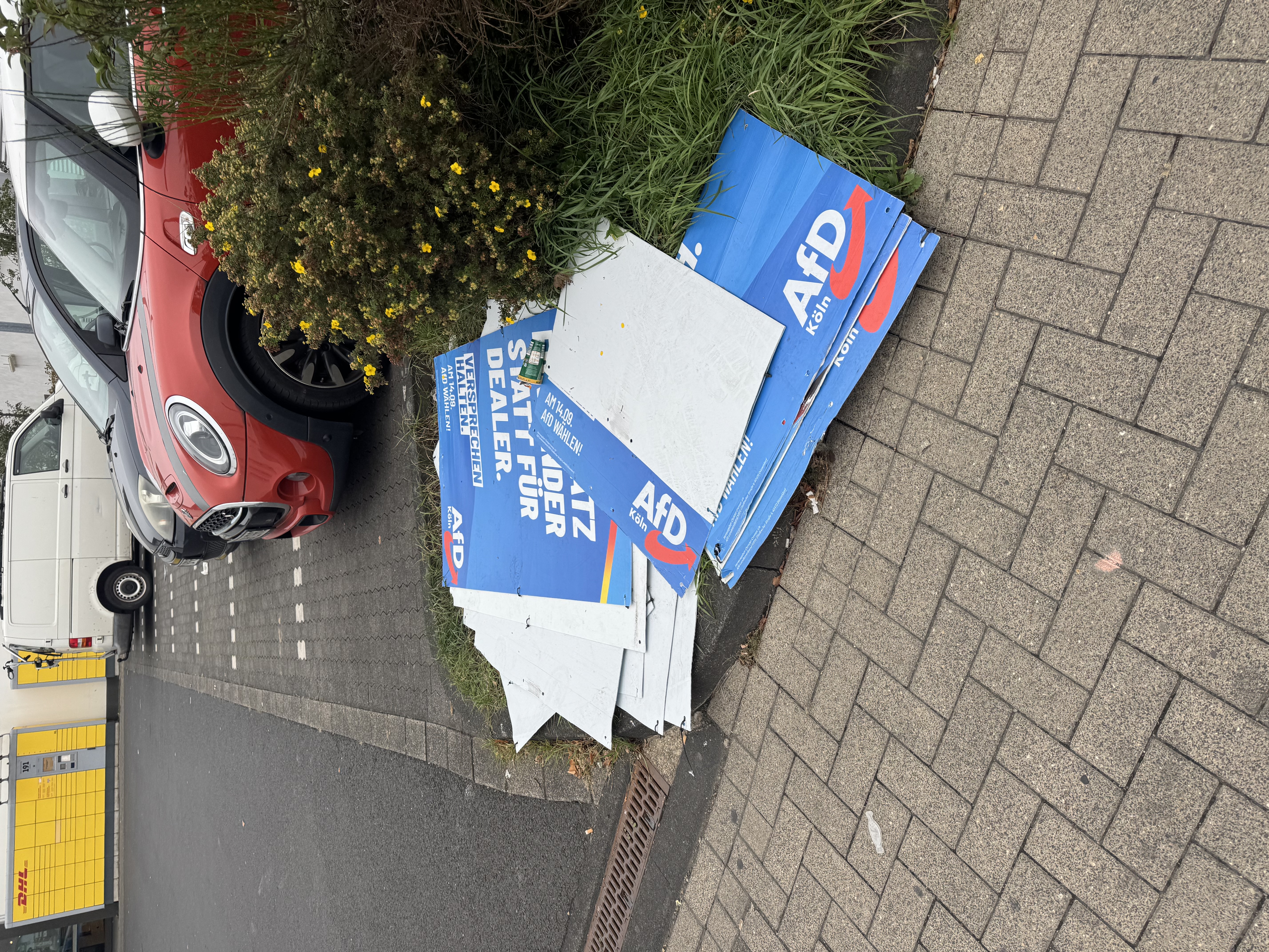 Am Parkplatz zu Aldi liegen abgerissene AfD-Plakate rum.