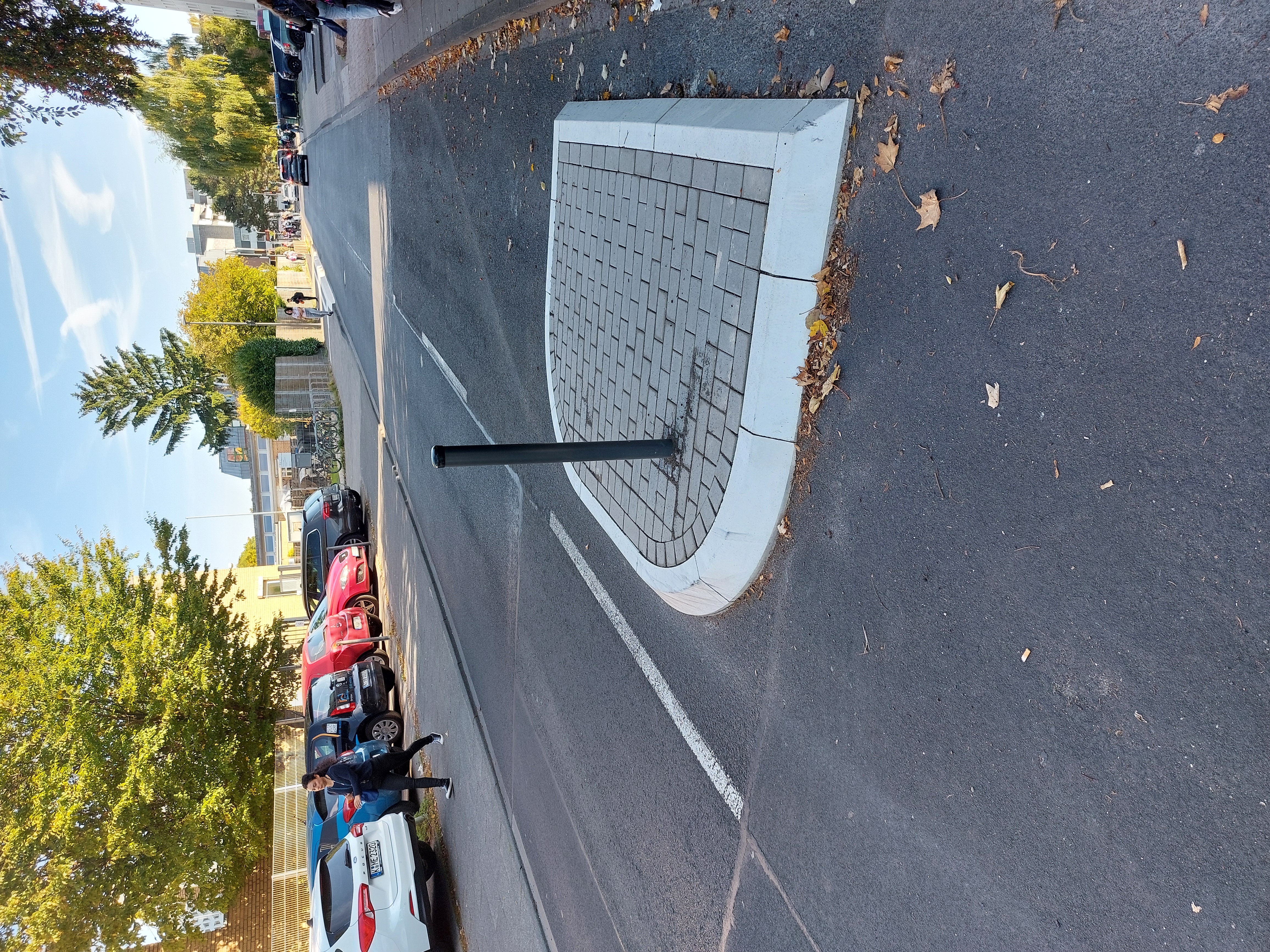 Es fehlt die rot-weiße Markierung. Bei Dunkelheit und /oder Blendung durch Sonnenlicht erhöhte Unfallgefahr vor der Erich-Ohser-Gesamtschule