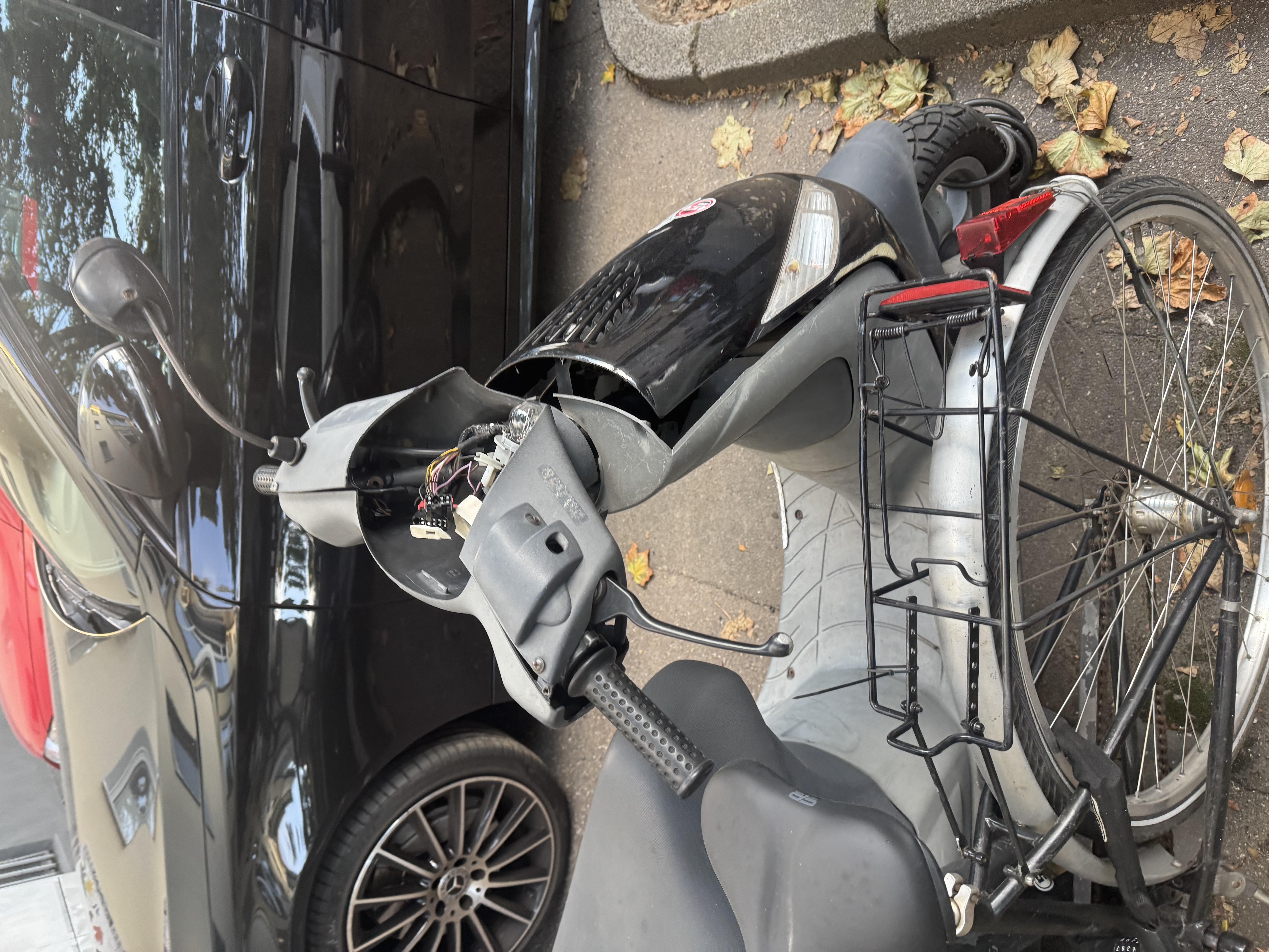 hier steht ein Schrott Roller an dem sich offensichtlich schon jemand zu schaffen gemacht hat