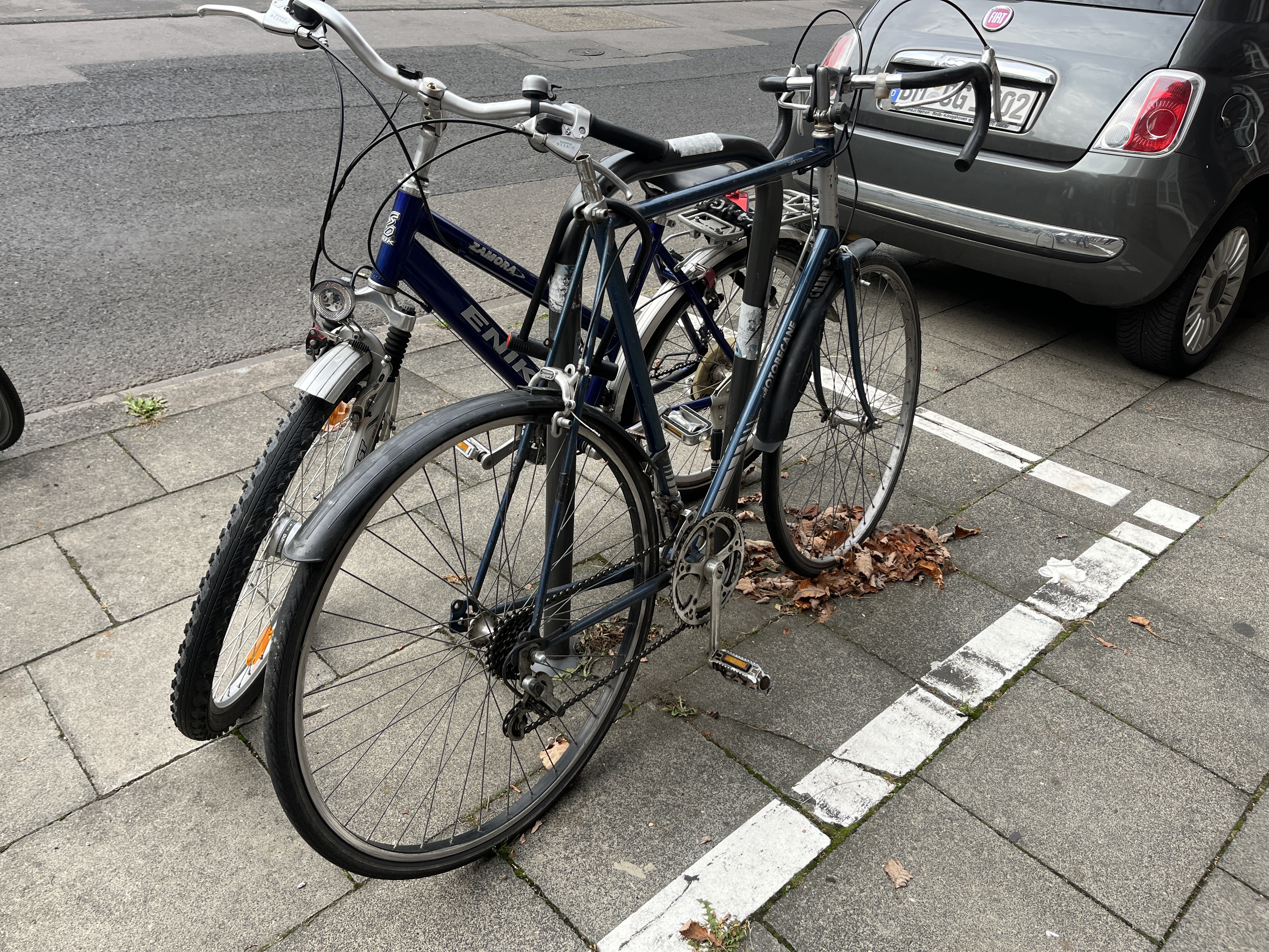 Das Fahrrad ohne Sattel steht seit Monaten abgeschlossen am Ständer angeschlossen, wird nicht bewegt