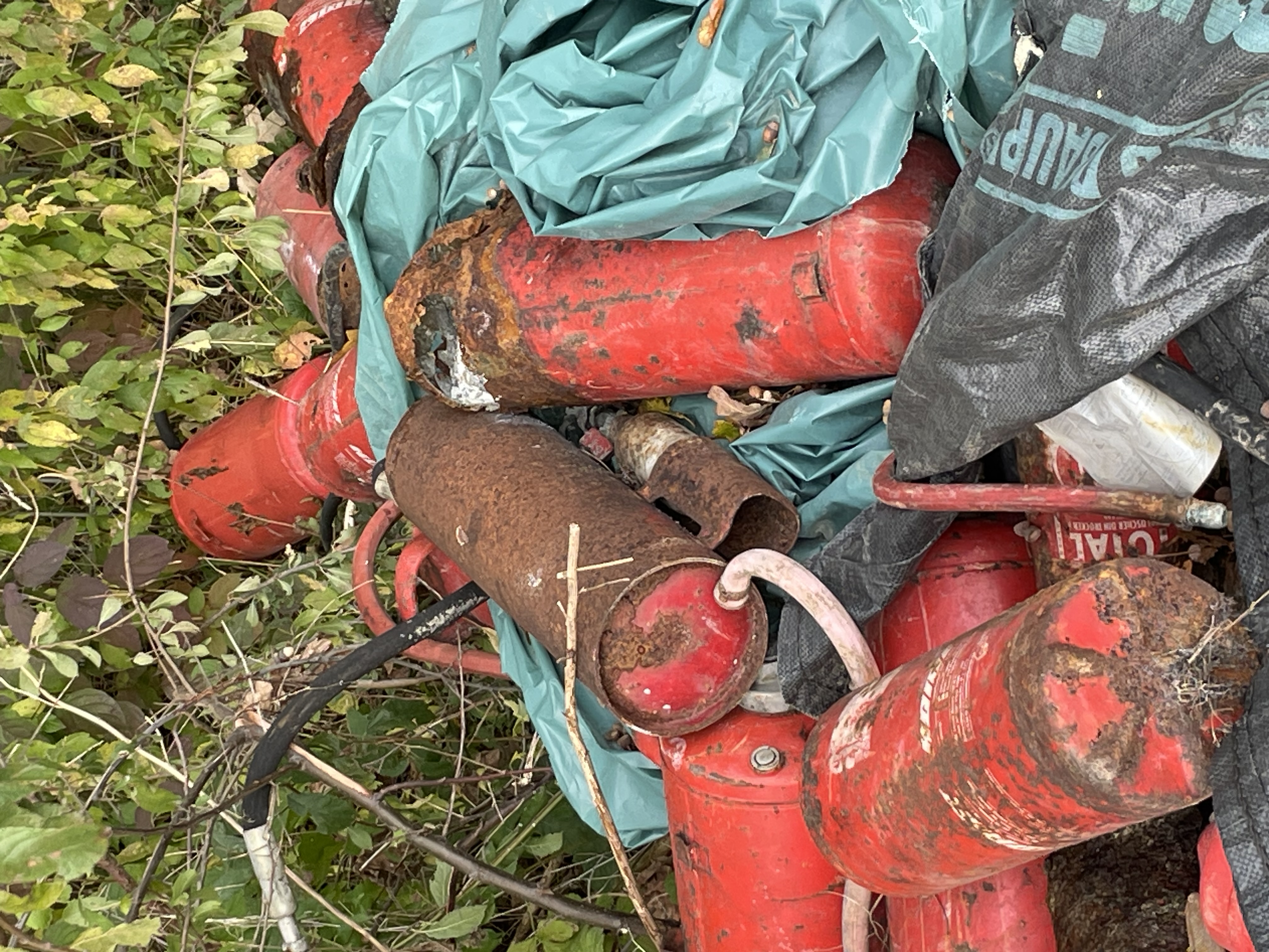 Von der Maulbonnerstr geht ein Grünstreifen am Herkenrath Weg entlang. Dort sind Feuerlöscher und umpfänglich Baumaterialien abgelegt.
