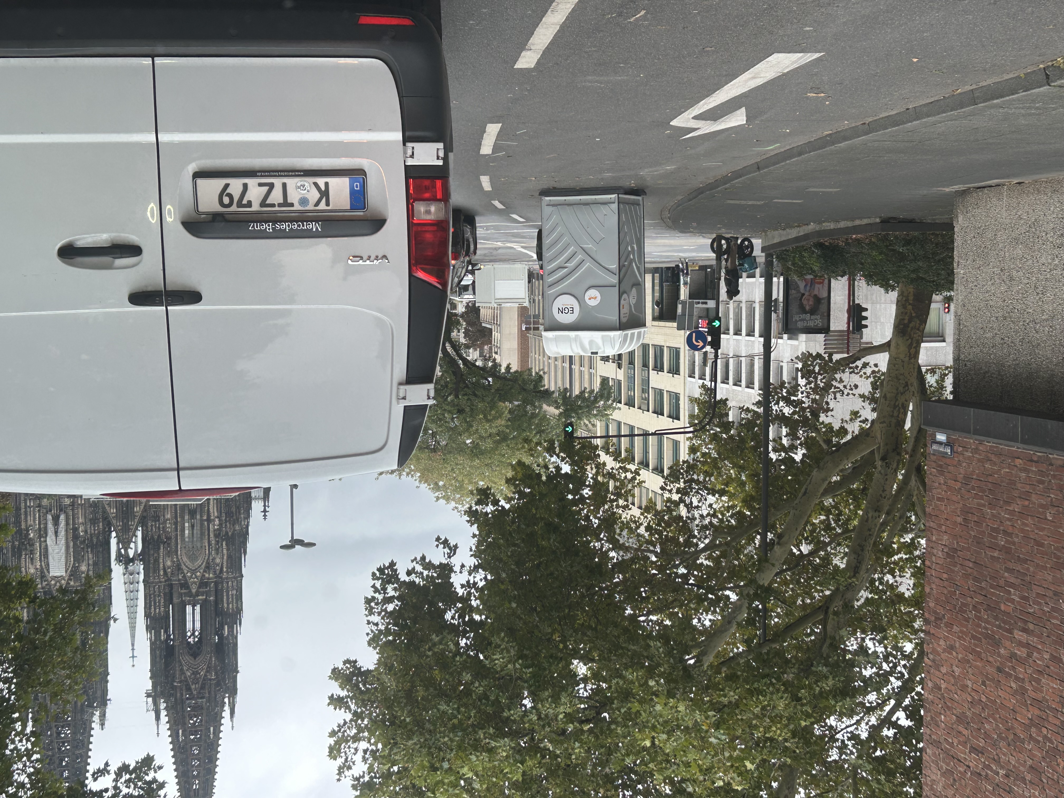 die mobile Toilette (vermutlich vom Köln Marathon) wurde vergessen, abzubauen und blockiert eine Linksabbiegerspur.