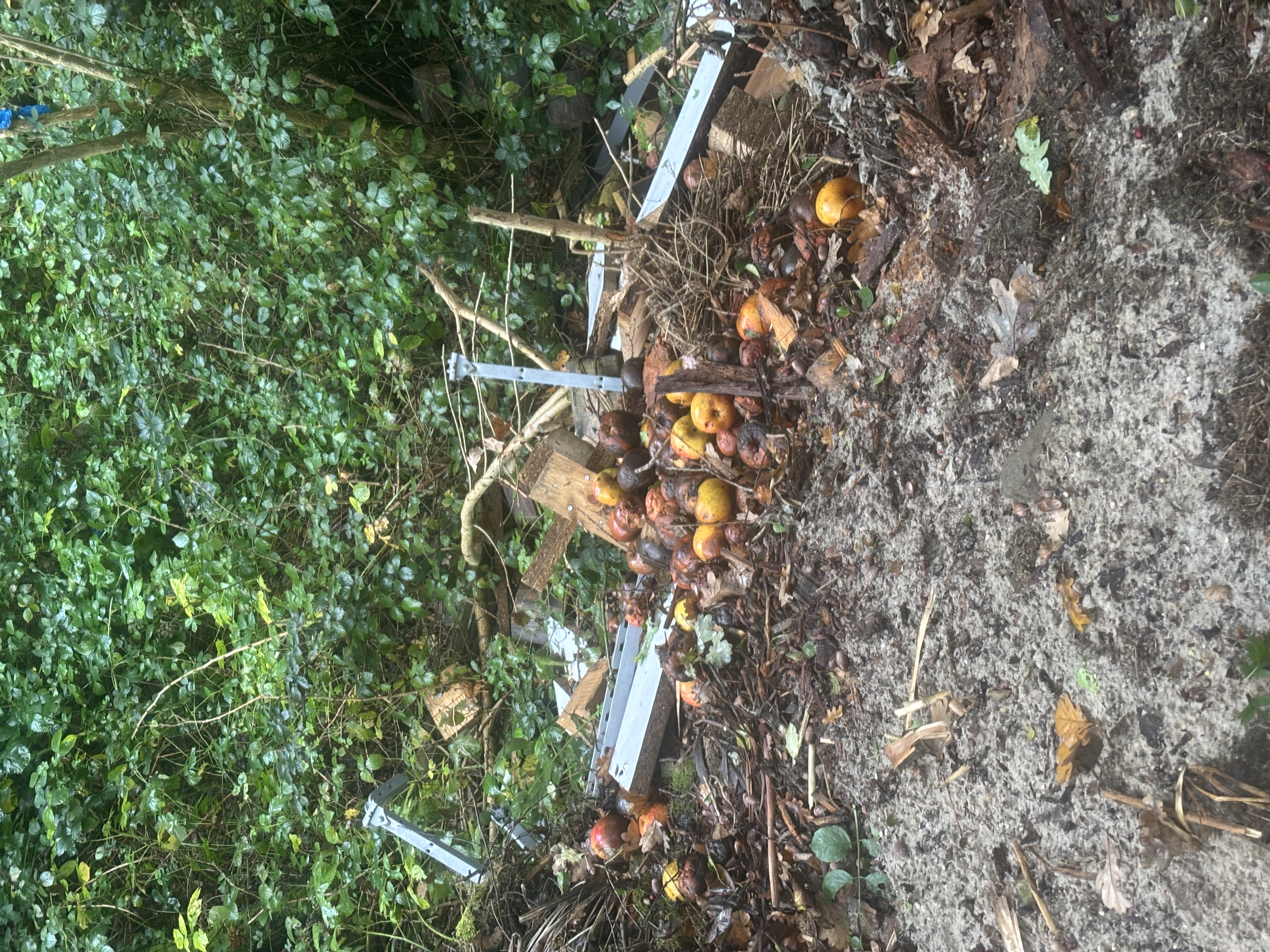 Ein mit alten Äpfeln beladener Anhänger wurde ein Hang hinuntergeschubst und liegt in der Natur
