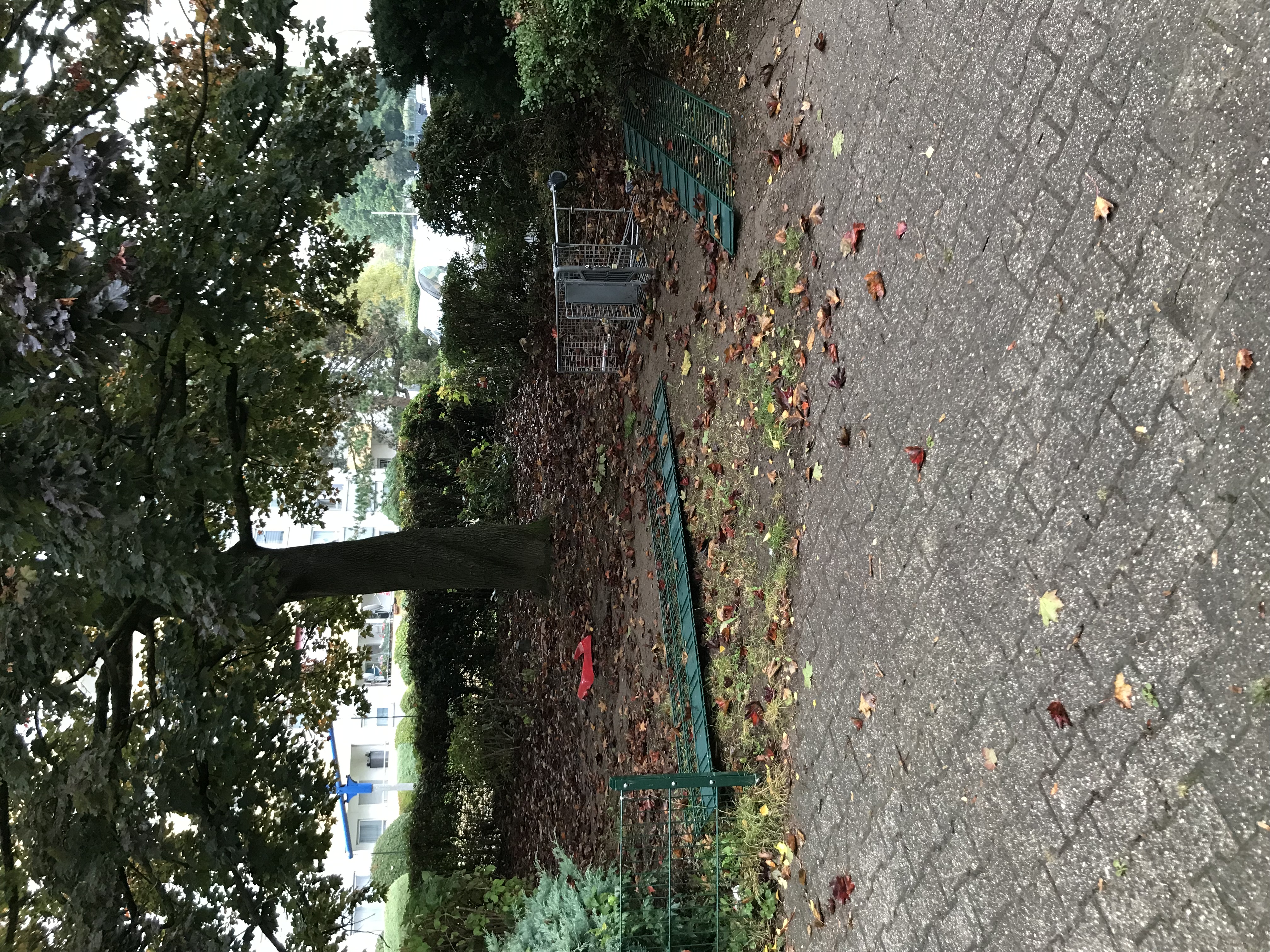 Zaun am Gehweg beschädigt. Auch hier befinden sich Einkaufswagen. Höhe Hausunterführung/Tunnel für Fußgänger von Friedrichstr. zu Glashüttenstr.