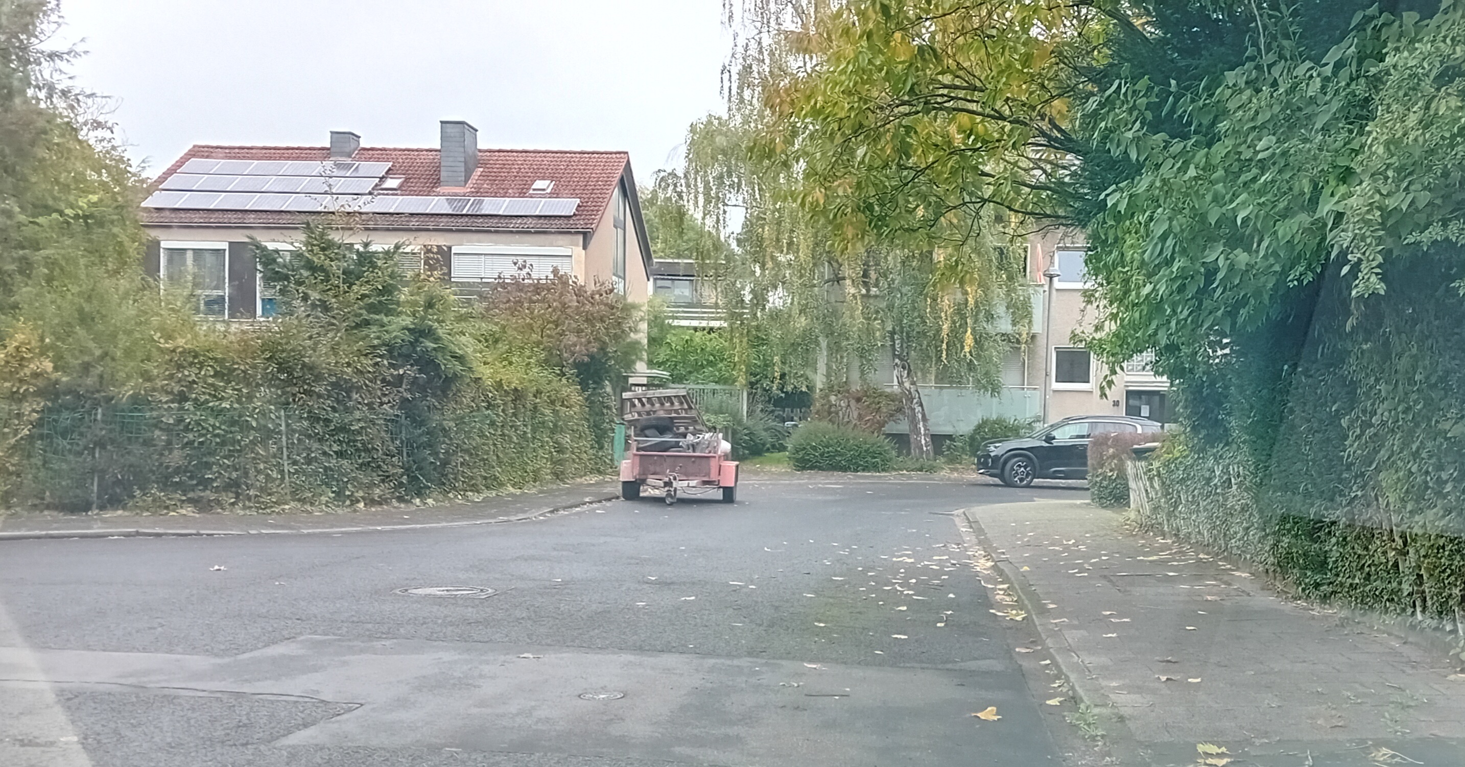 Dieser Anhänger, vollgeladen mit Schrott, steht seit Samstag mitten in der Kurve und behindert extrem den Straßenverkehr.