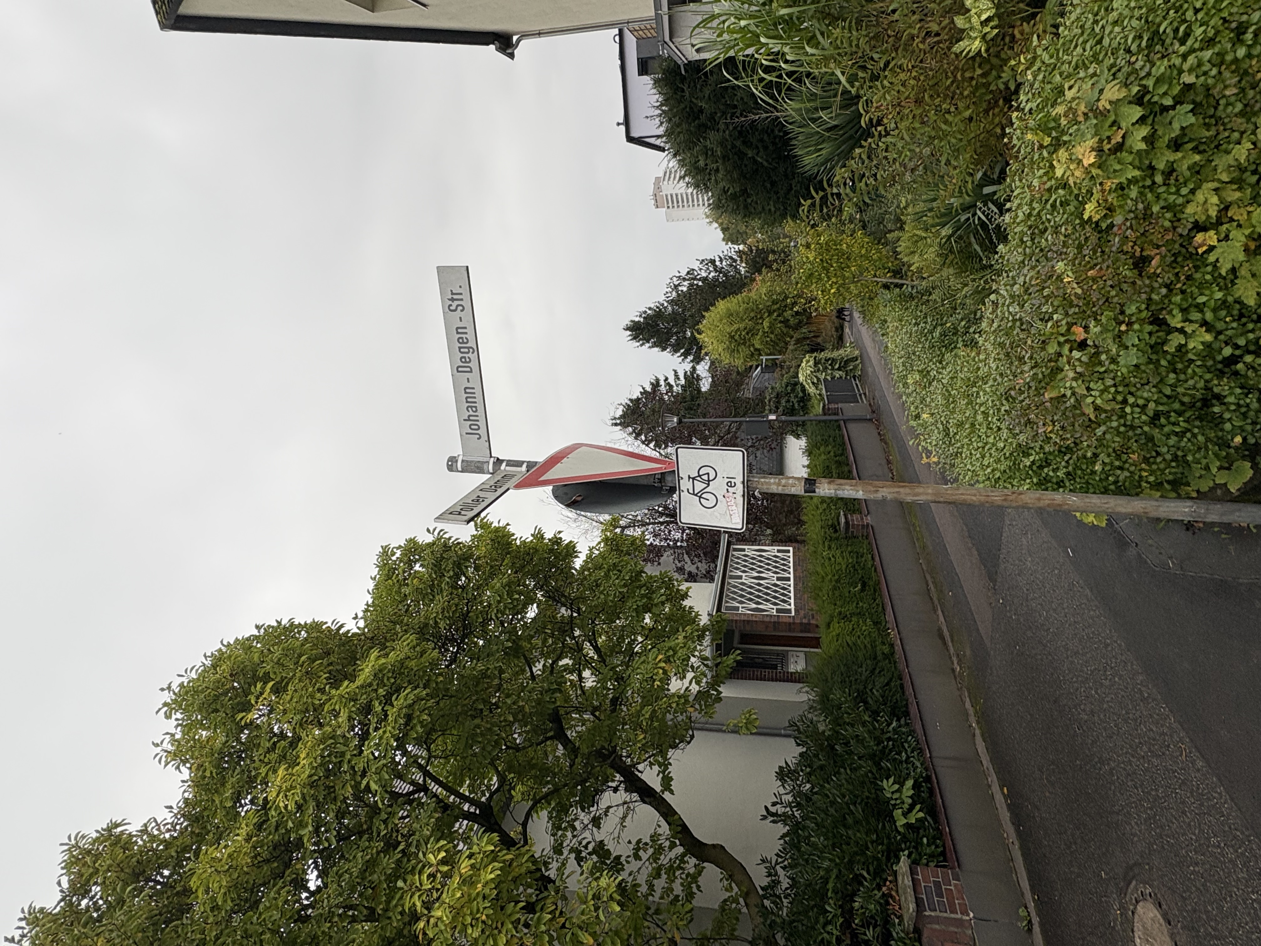 Das Straßennamen-Schild sowie die am Pfosten montierten Verkehrsschilder sind um 90 Grad gedreht.
