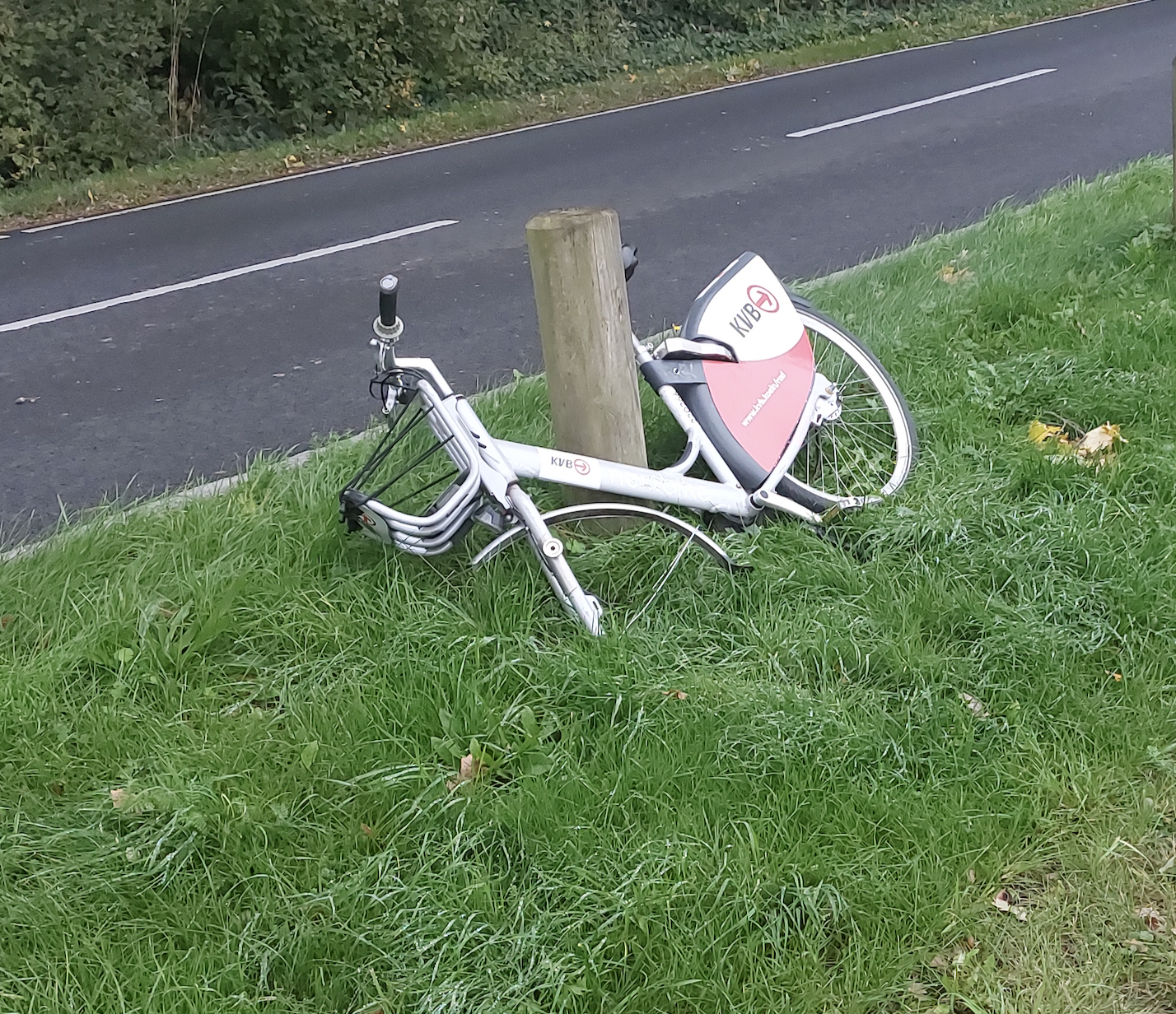 Pesch, Pescher Str. vor Ortsausfahrt: KVB-Rad ohne Vorderrad im Gras neben der Straße.