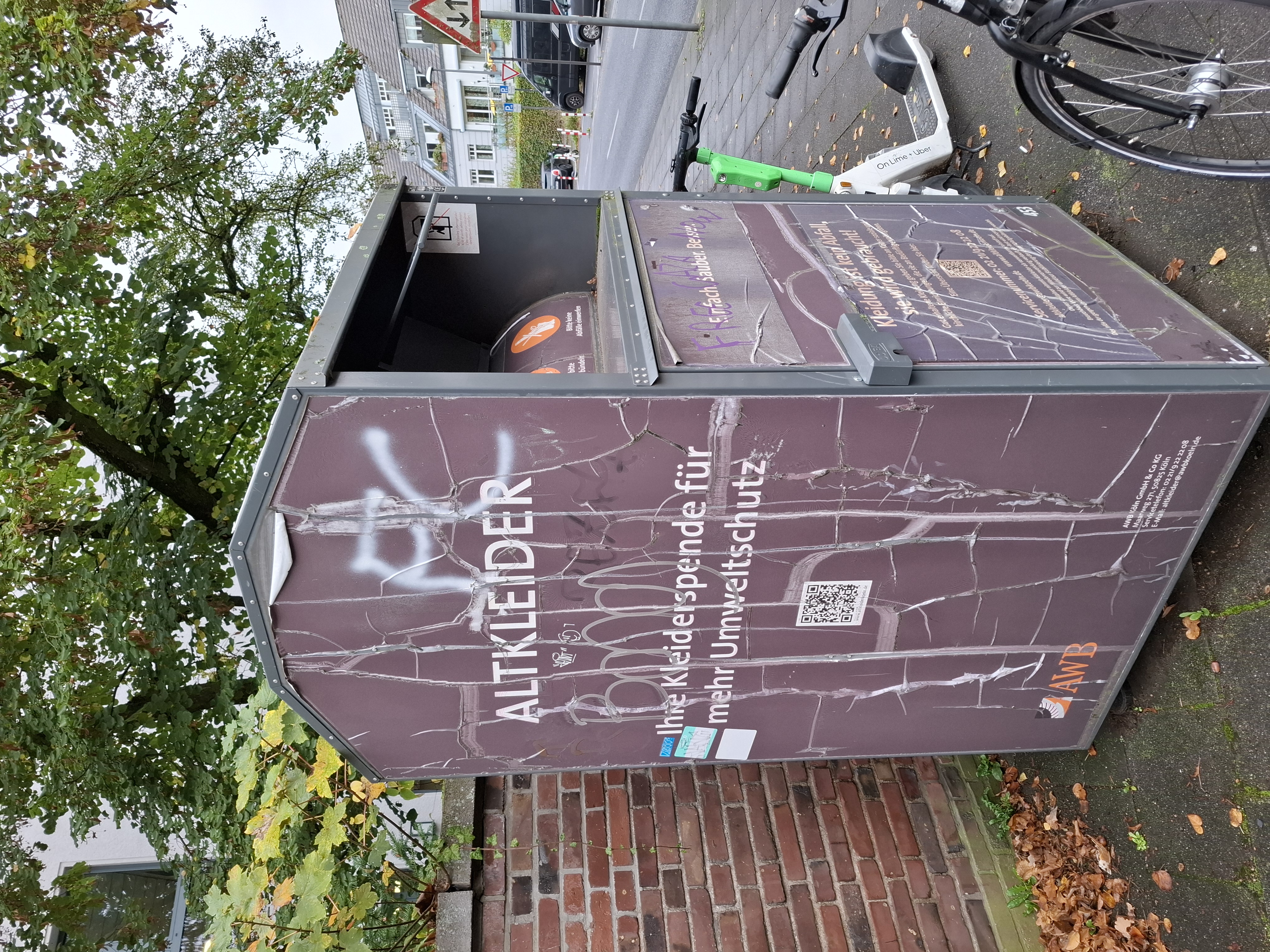 komplett versiffter Altkleidercontainer, sollte ausgetauscht/gereinigt werden; bitte Weiterleitung an die AWB wegen Zuständigkeit