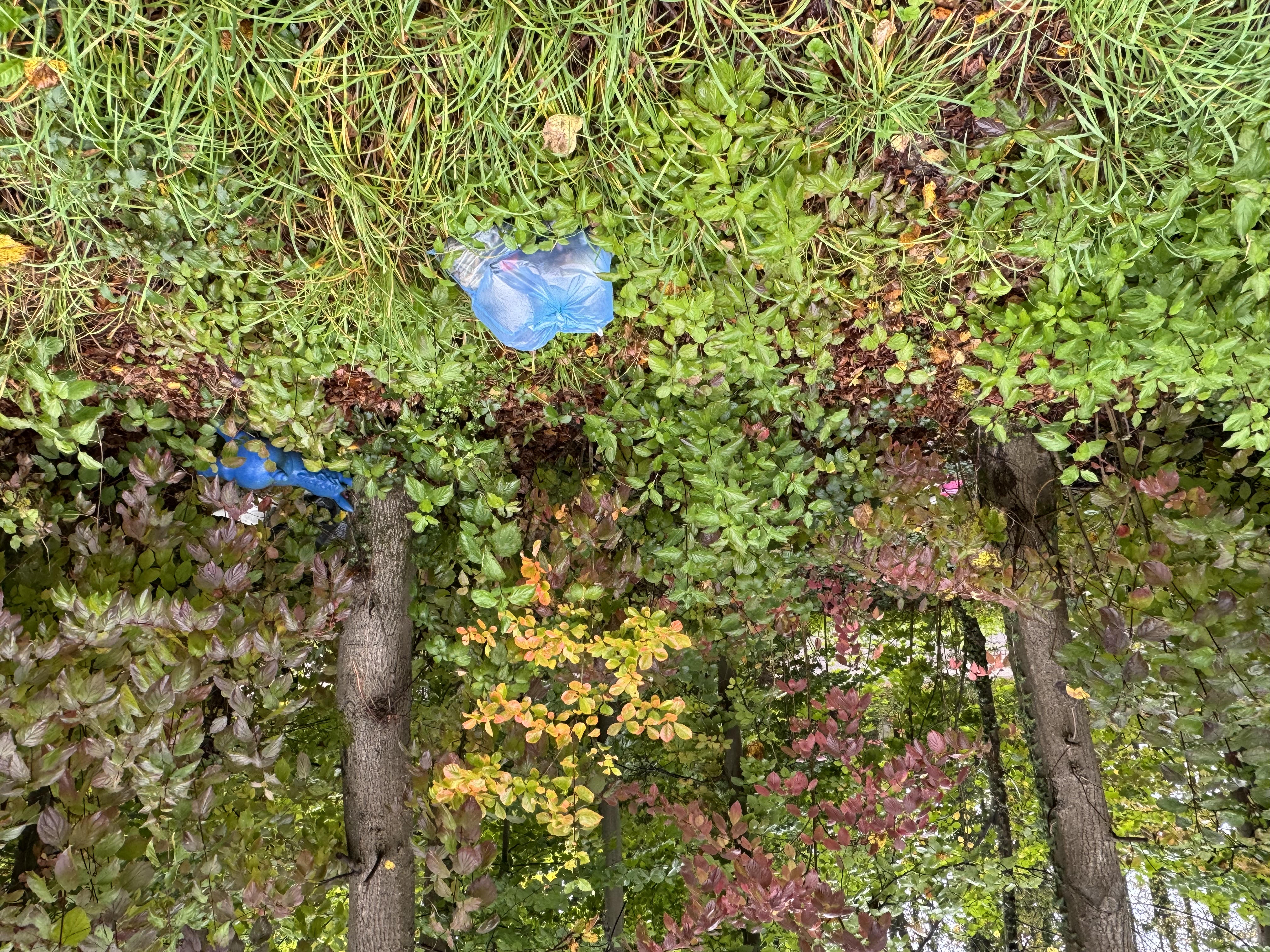 Parkplatz Leidenhausen 2. Einfahrt links linke Seite mit einem blauen Müllbeutel vom Müllsammeln markiert. Rechts und links vom Müllbeutel im Gebüsch diverse große Spielsachen und andere Teile.