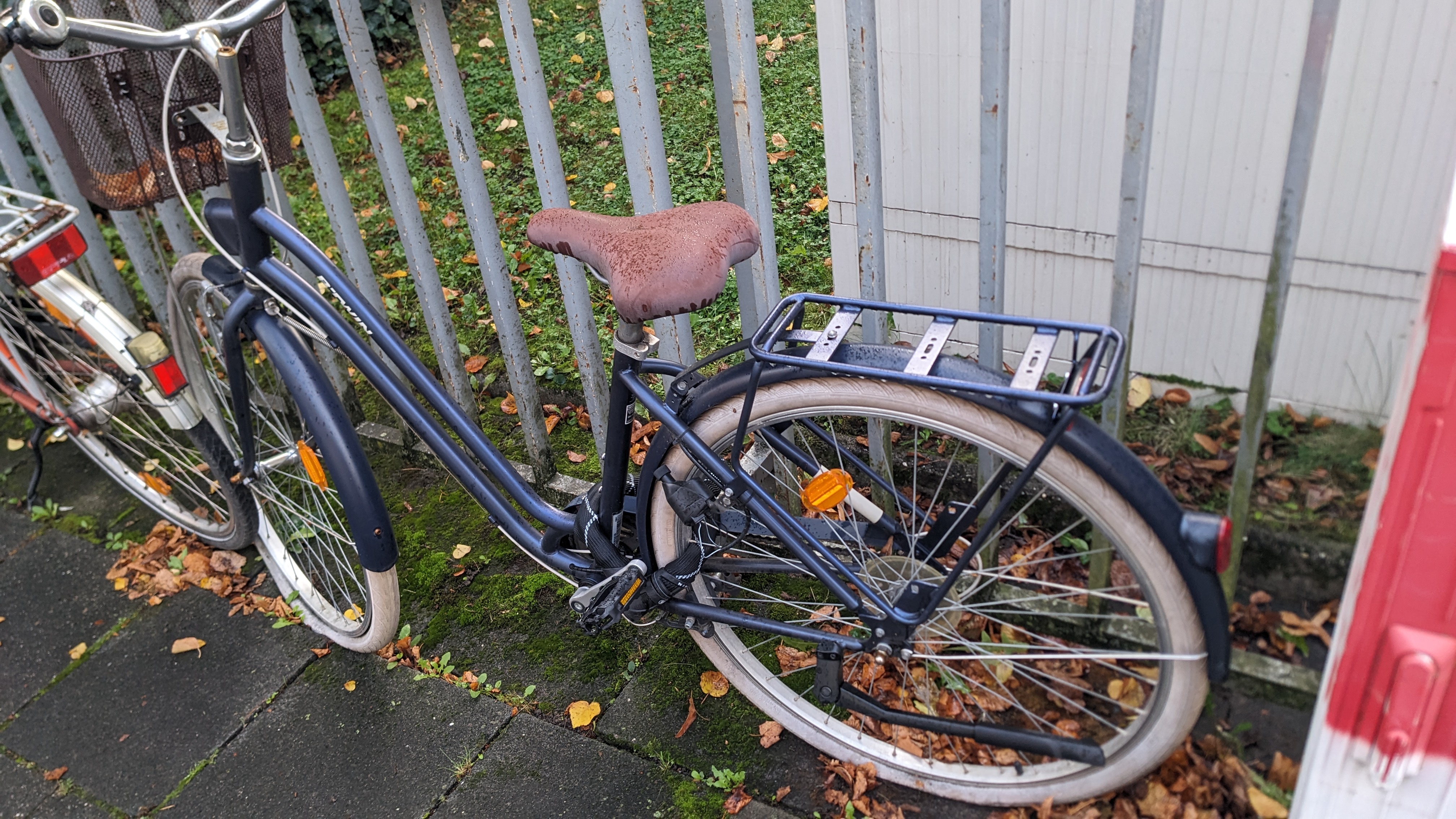 Zwei mal das Selbe blaue Fahrrad. Mit platten Reifen und seit über einem Jahr nicht bewegt. Bitte mit Zettel versehen bzw. entfernen. An dem Geländer steht noch ein graues Rad auch mit Platten. Bitte ebenfalls mit Zettel versehen. Vielen Dank.