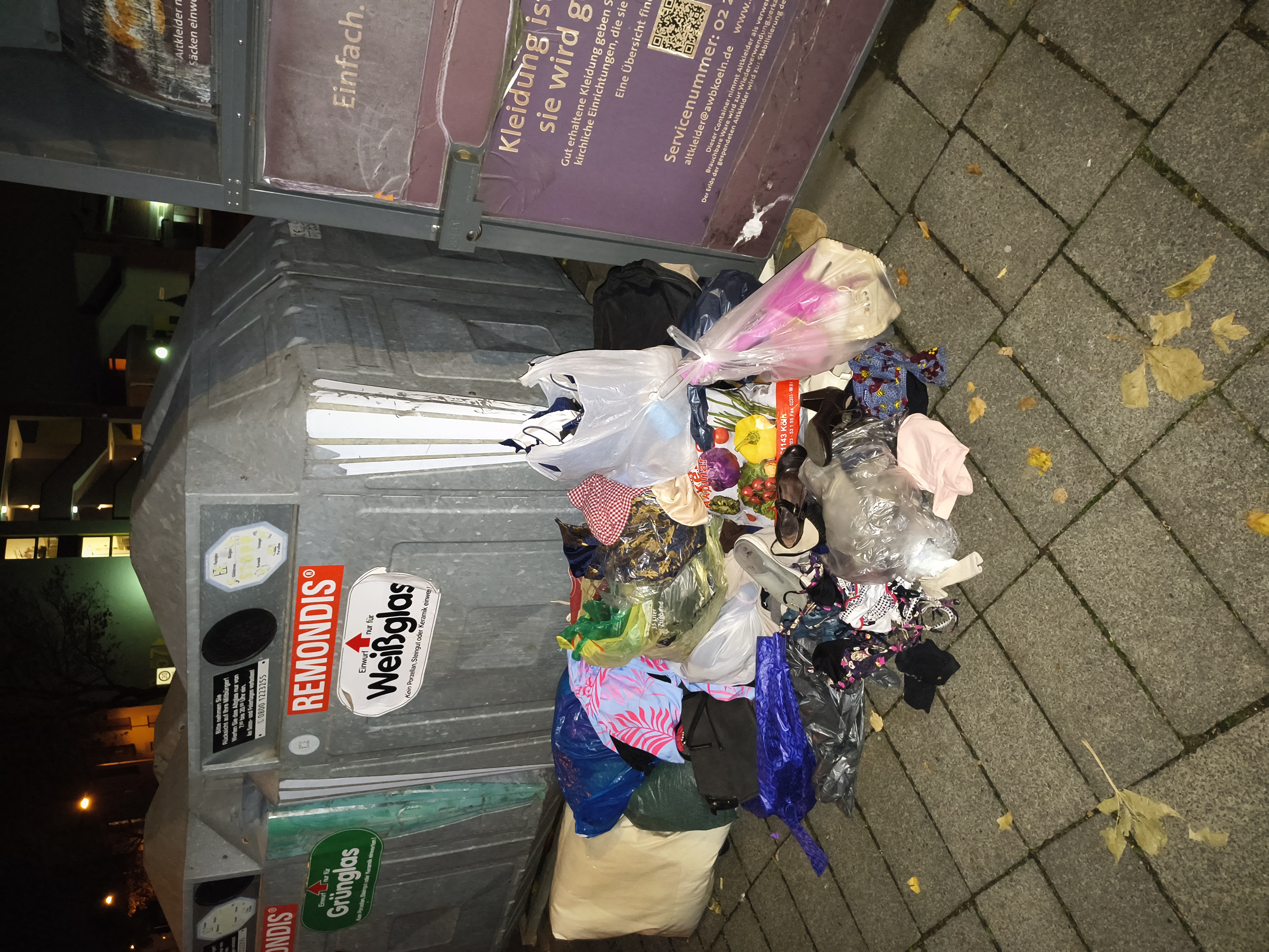 Nachdem offensichtlich der Altkleidercontainer geleert wurde, sieht es schlimmer aus, als vor der Leerung! Säcke mit Kleidungsstücken und diverser Unrat liegen jetzt vor dem Altkleider- u. Glascontainer. Warum wurden die Dinge nicht gleich mit entsorgt? Muss denn erst immer X-Mal eine Meldung erfolgen, bis endlich reagiert wird?!