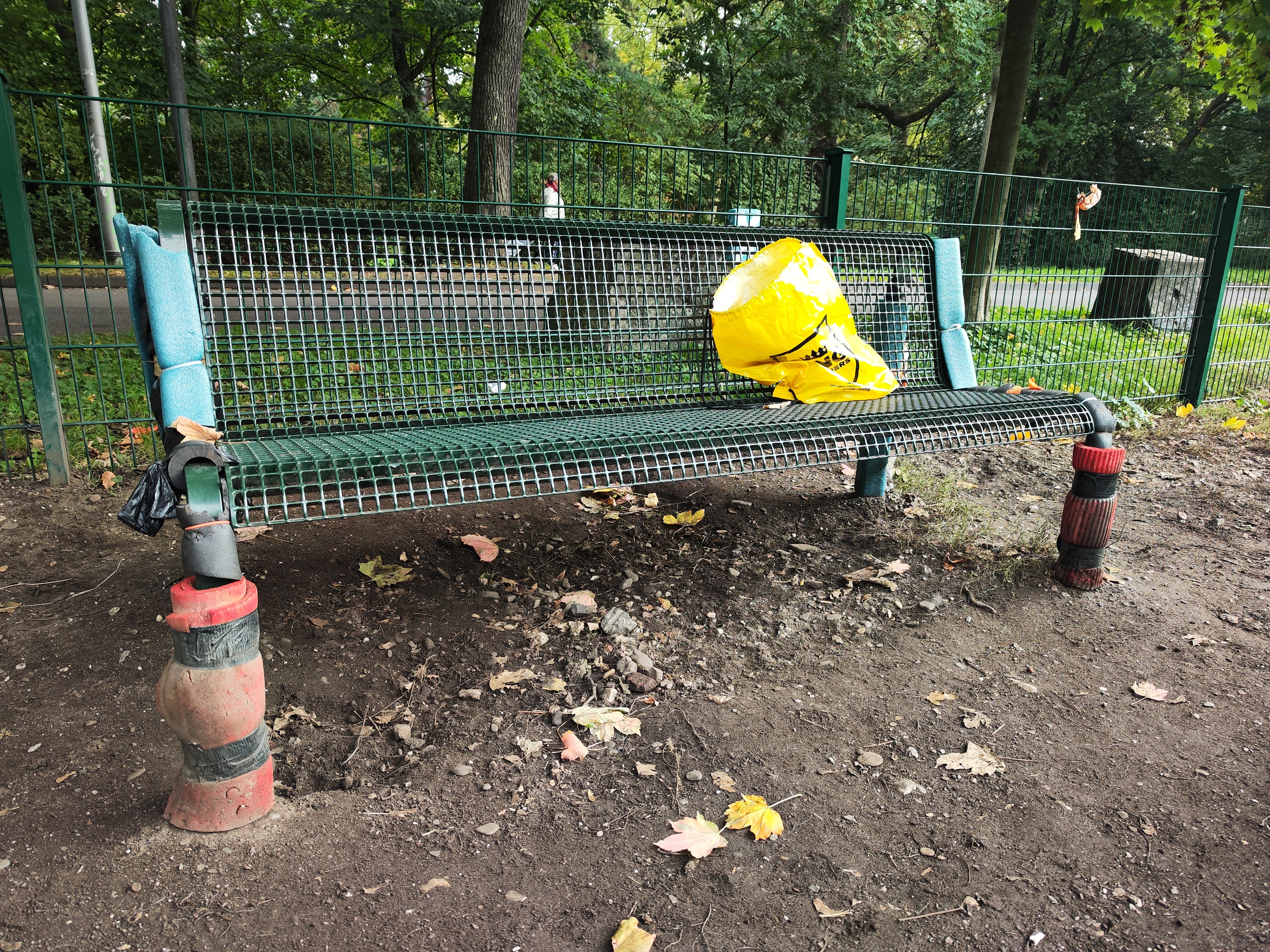 Auf der Hundefreilauffläche sind die Bänke mit Schaumstoff umwickelt worden. Das ist unhygienisch und führt zu Rost.