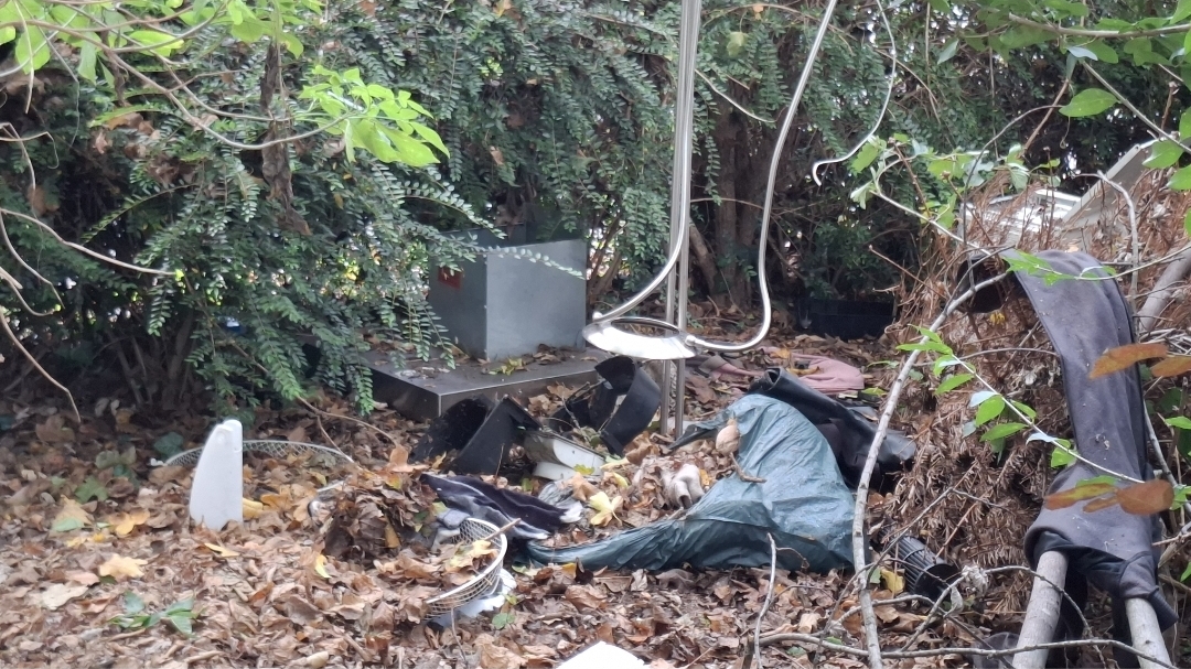 Elektroschrott (Stehlampe, Küchengeräte, PC) im Gebüsch