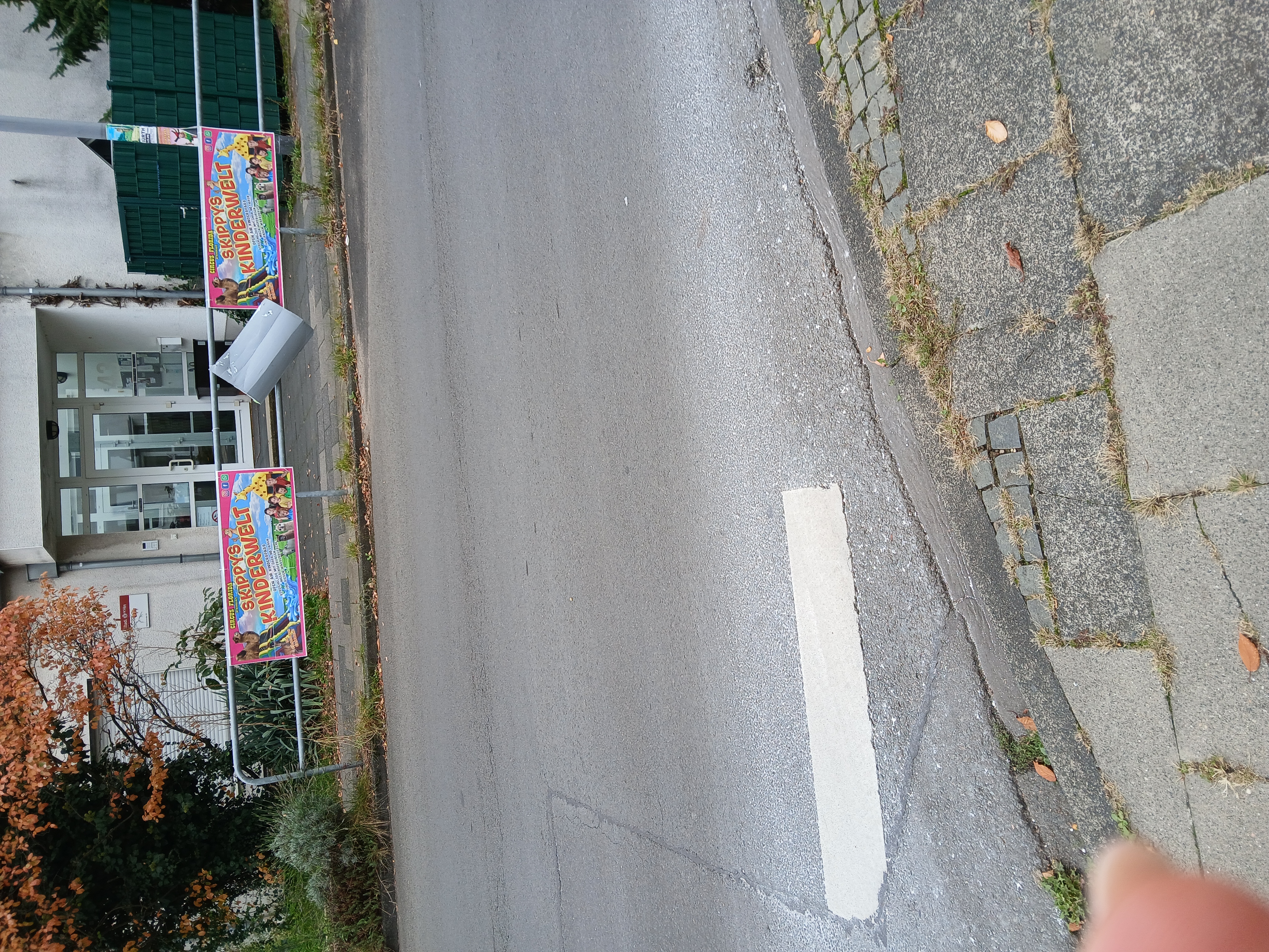 An der Kita hängen seit längerer Zeit drei Plakate 'Skippys Kinderwelt'. Ein Plakat wird sich bald lösen und auf die Fahrbahn fallen. Unfallgefahr. Und die Veranstaltung existiert auch nicht mehr