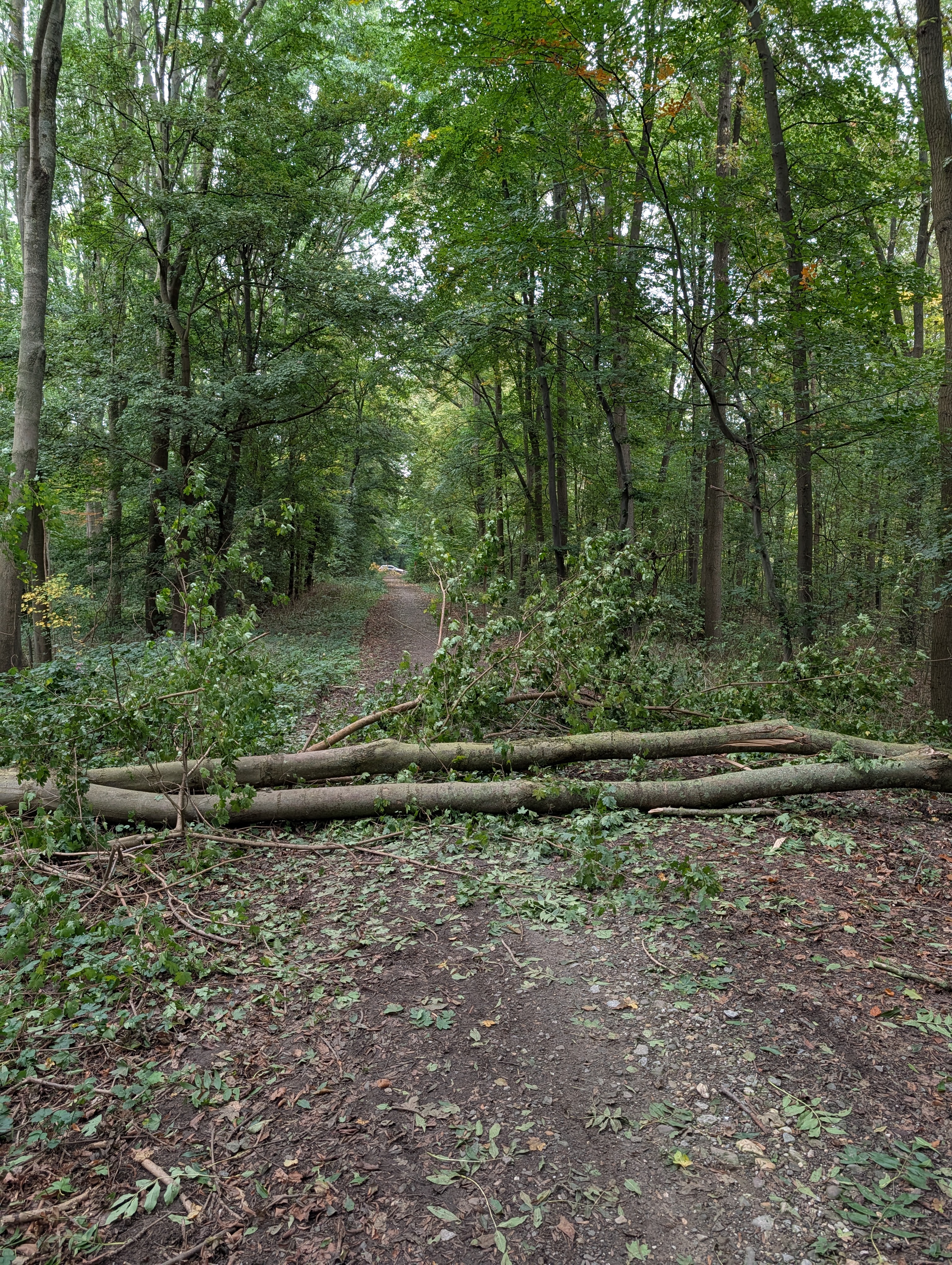 Umgestürzter Baum blockiert Waldweg.