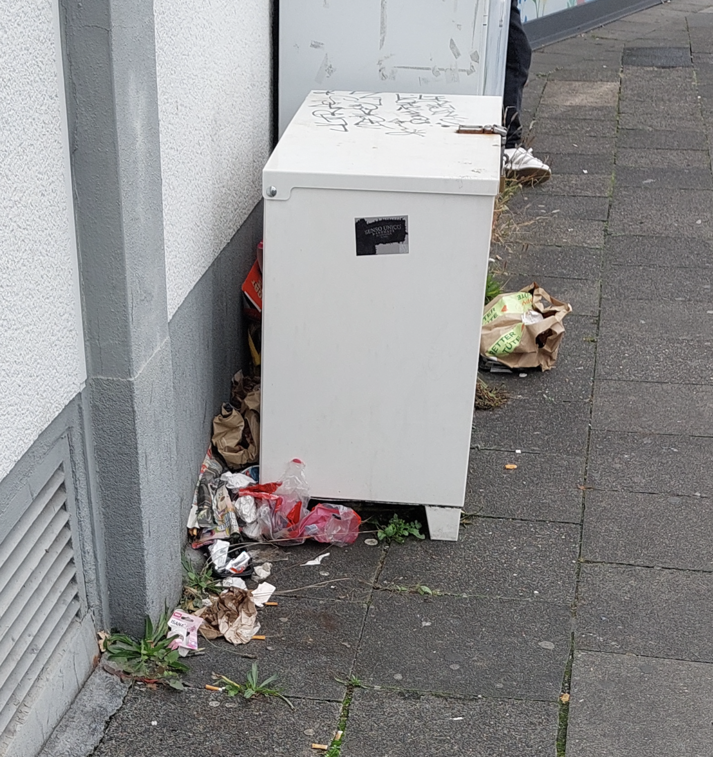 Longerich, zwischen Edeka und Rossmann: Hinter dem Verteilerkasten alles vermüllt. Generell immer sehr schmutziger Gehweg! Bitte säubern.