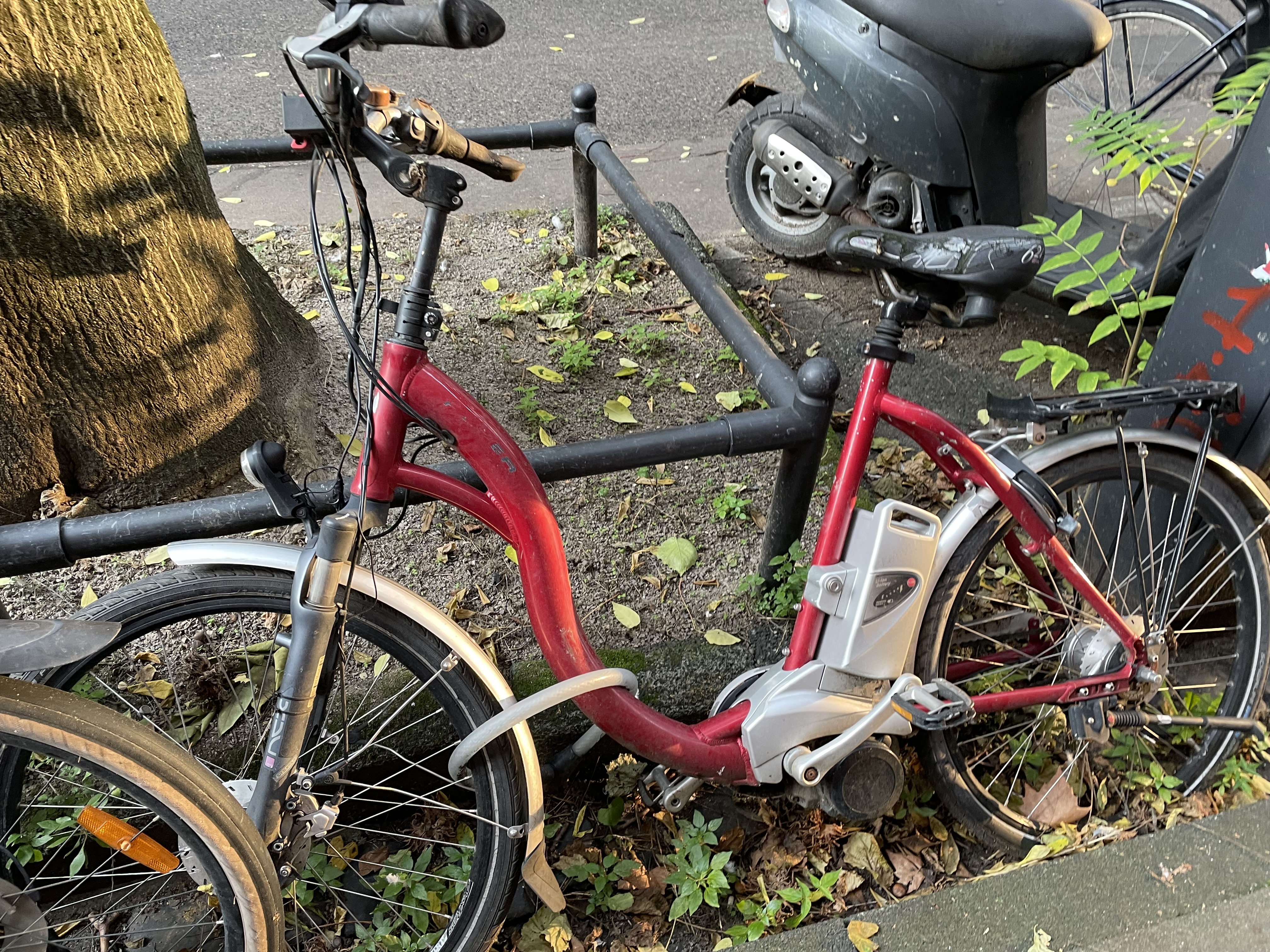 Neben dem roten Fahrrad befindet sich ein schwarzer Motorroller. Beide werden offensichtlich nicht mehr genutzt und versperren Parkplatz und vermüllen.