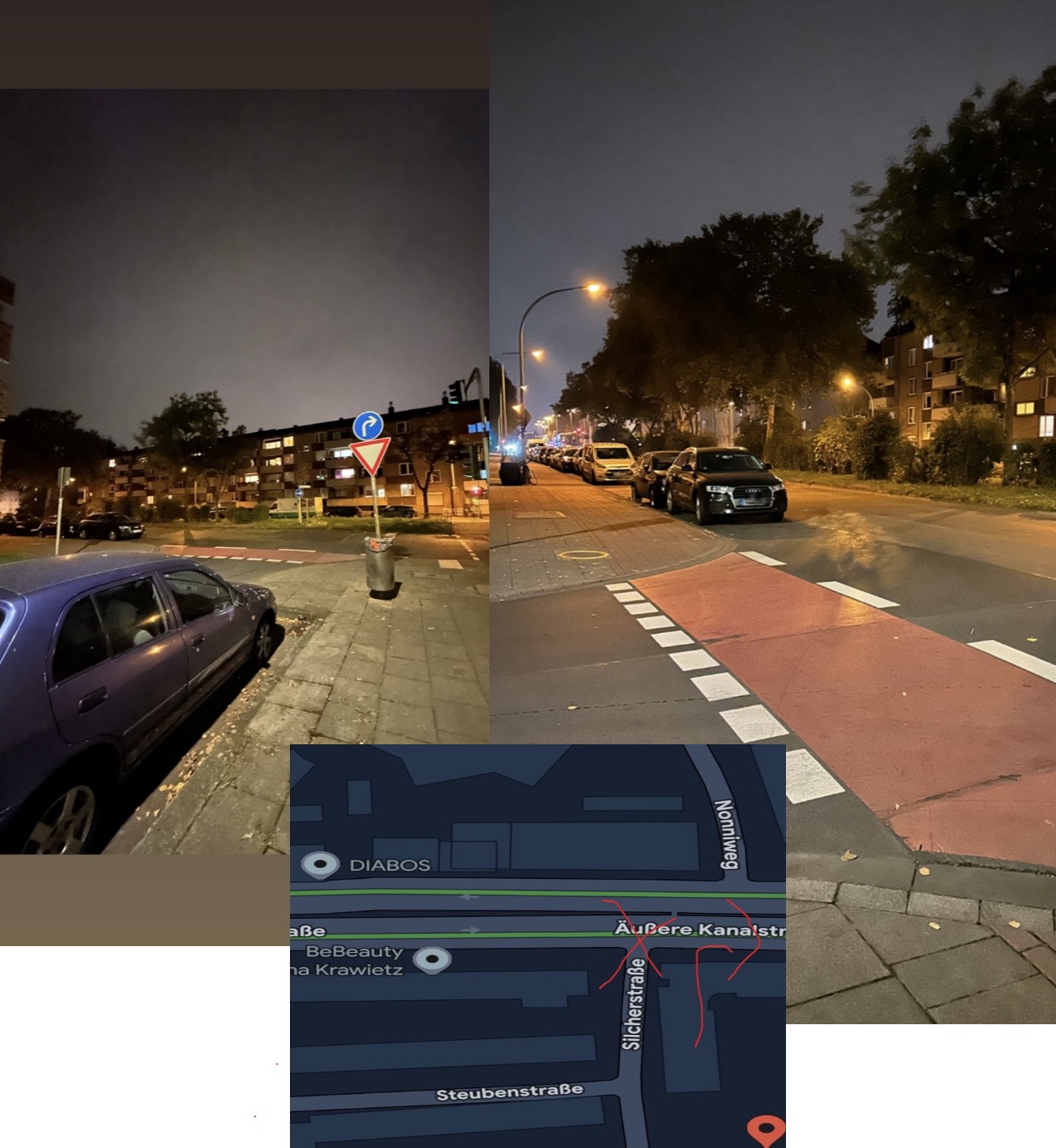 Beim Einbiegen von der Silcherstraße auf die Äußere Kanalstraße kann man aufgrund parkender Fahrzeuge direkt an der Ecke kaum erkennen, ob sich Fahrzeuge auf der Äußeren Kanalstraße von links nähern.