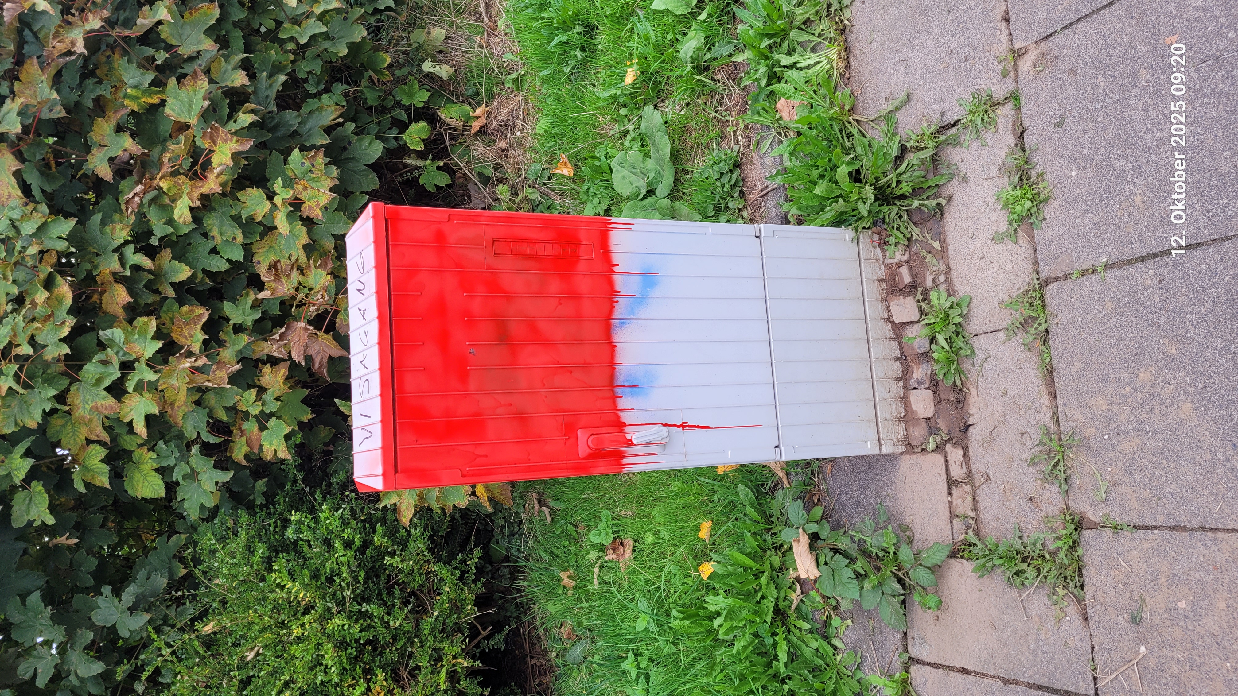 Besprühter Elektro Verteilerkasten in der Farbe Rot. Kontakt-Telefonnummer ist nir schwer lesbar. Neu Graffiti Berberitzenweg 4 50769 Köln Deutschland Statusvermerke Das Anliegen wurde erstellt. Neu So., 12.10.2025 - 11:44