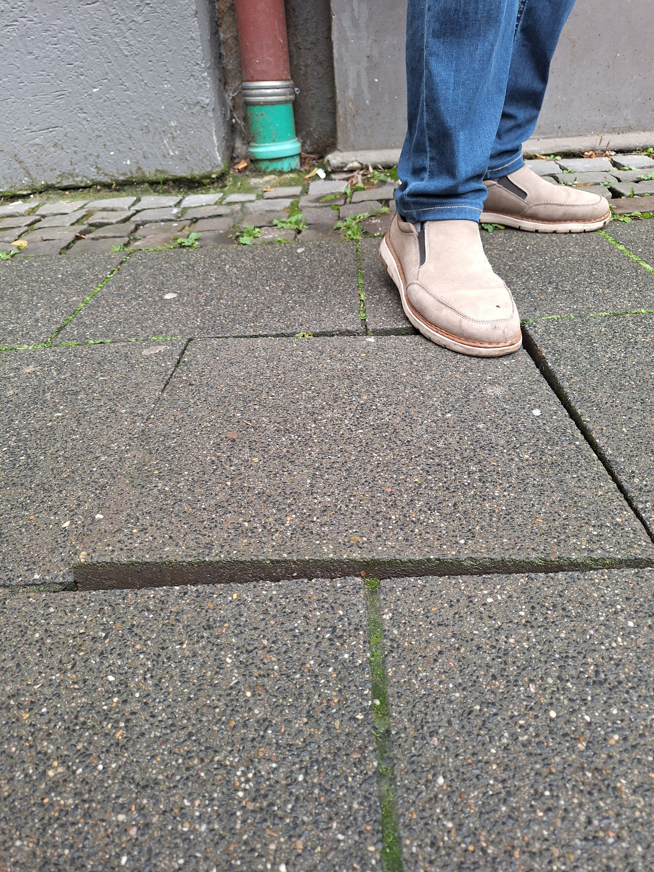 Im Verlauf des Fußweges Richtung Tiefentalstraße sind weitere gebrochene Platten, oder durch Wurzelwuchs angehoben.