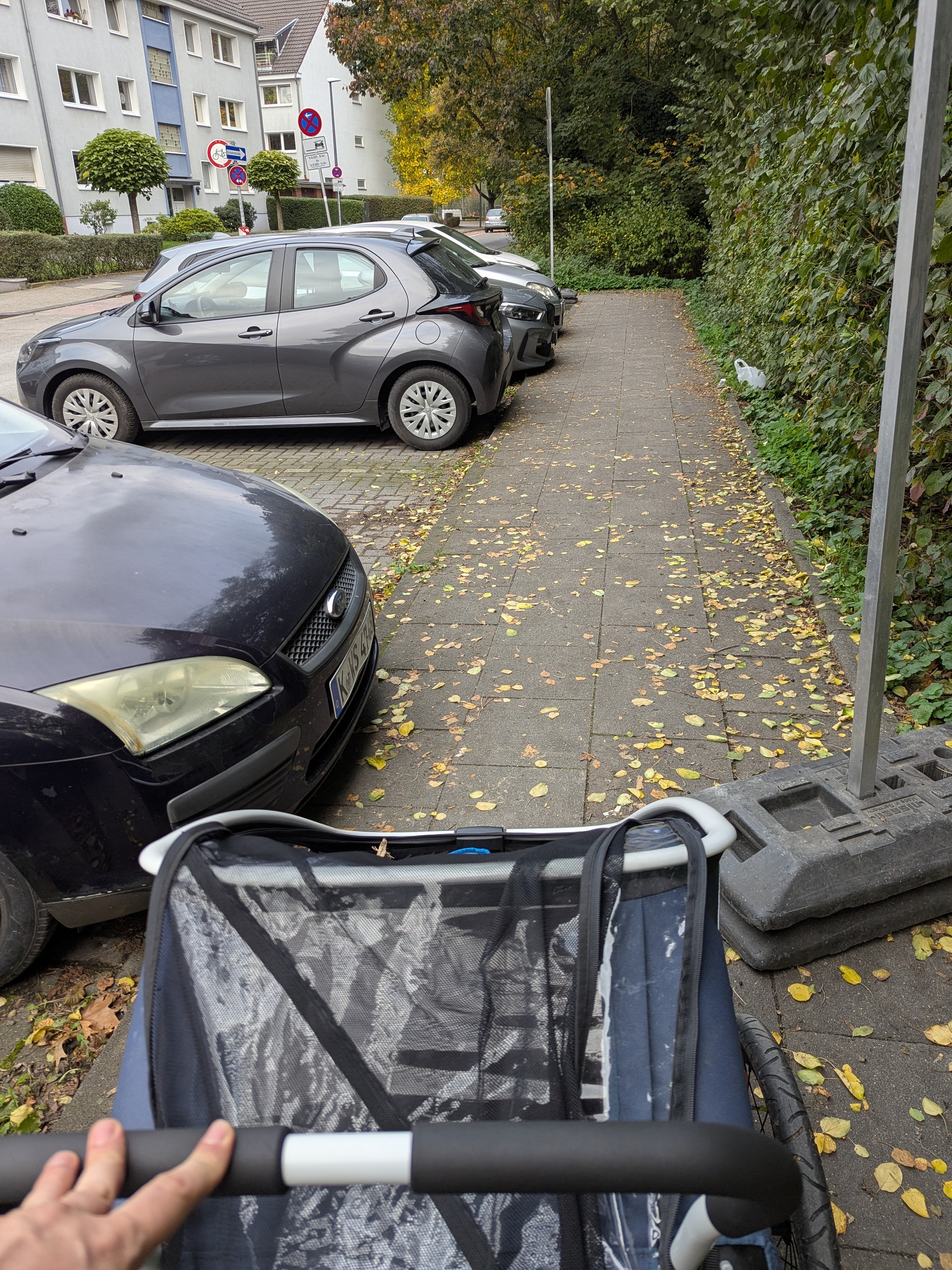 Mobiles VZ steht behindernd auf dem Gehweg. Müsste mit Zwillingskinderwagen umkehren und die Straßenseite wechseln und hinter der Behinderung wieder zurück wechseln. Gefährliche Stelle.