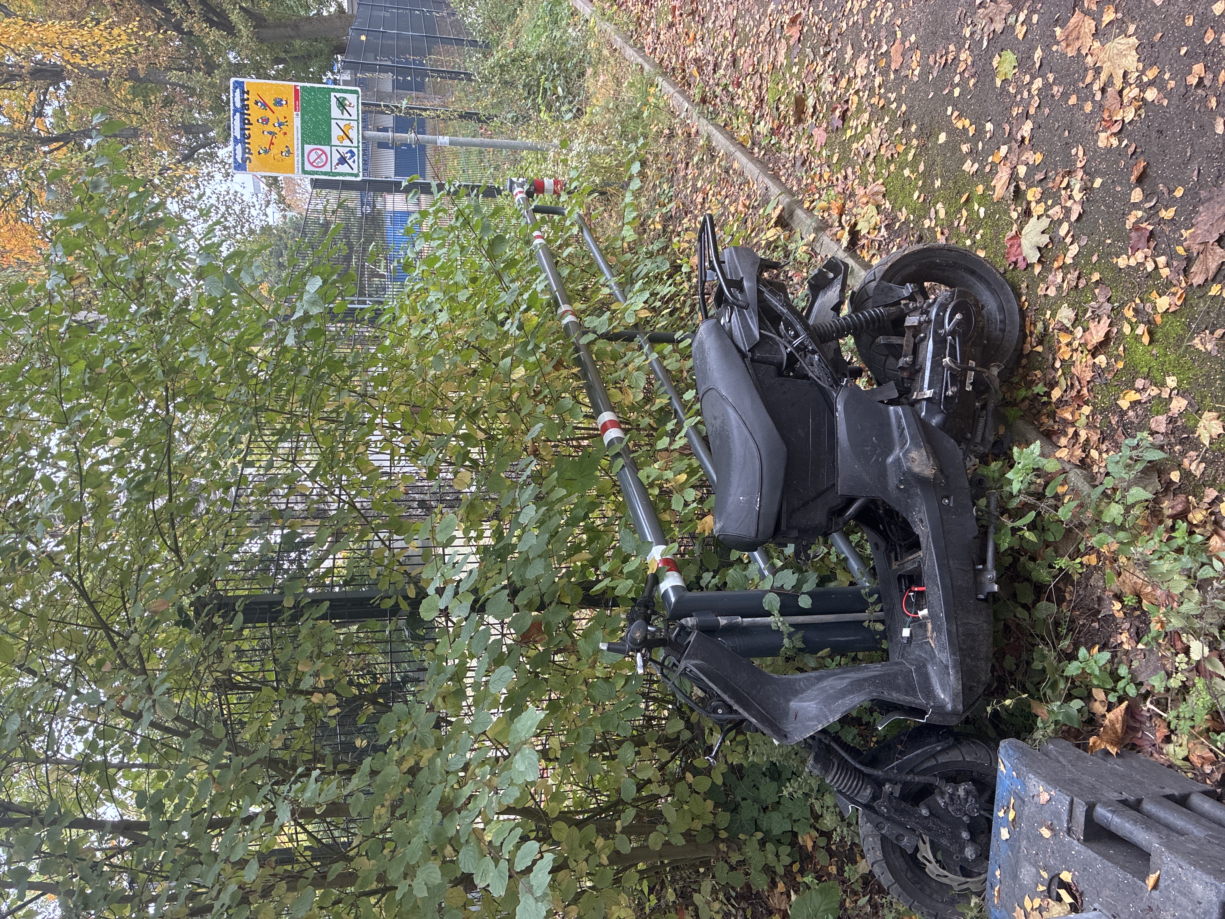 Roller steht am Spielplatz. Roller sieht augenscheinlich ausgebaut aus und liegt hier schon länger rum