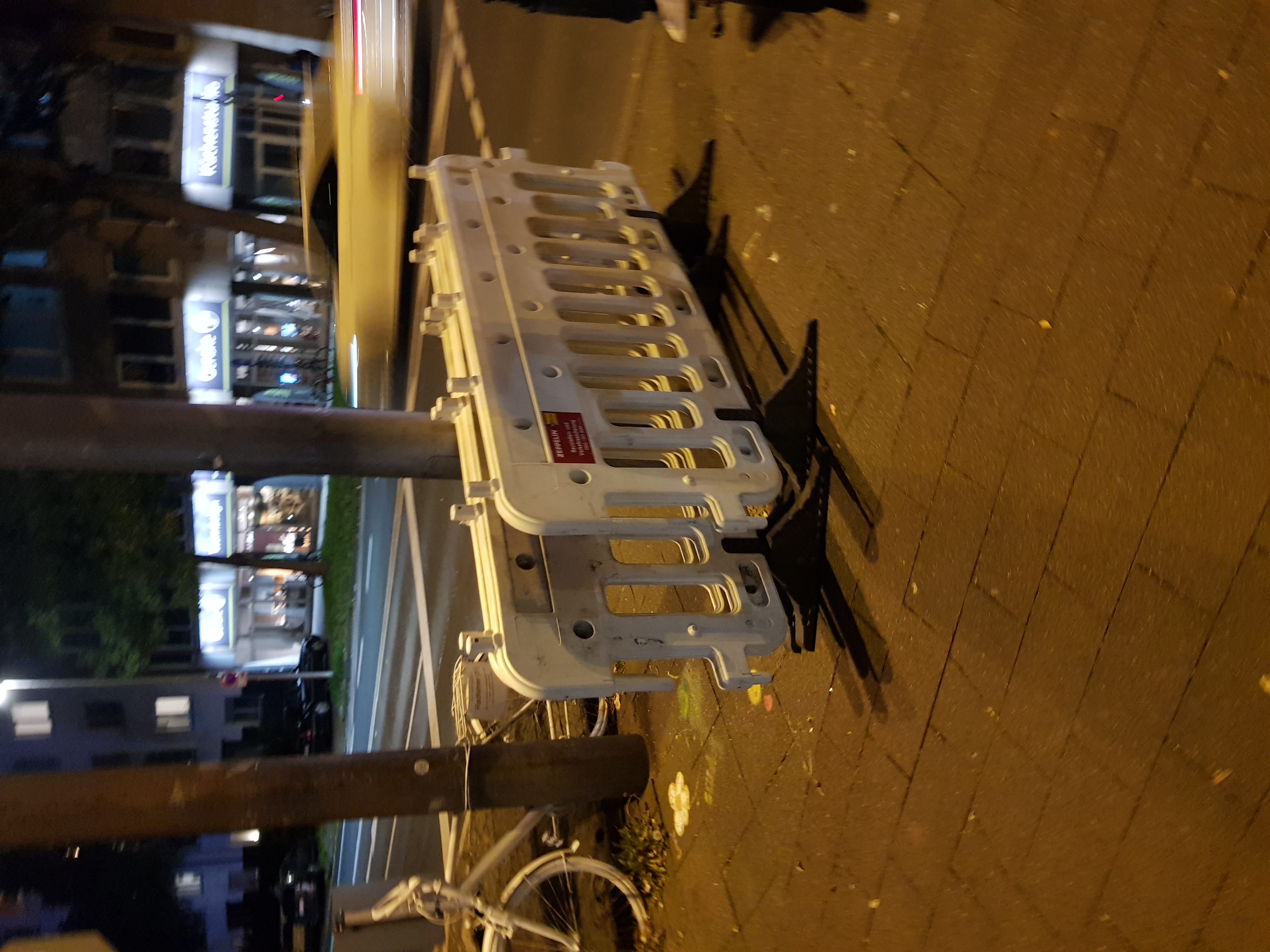 Auf der Verkehrsinsel Subbelrather/ Innere Kanalstrasse stehen mehrere Absperrschilder, wahrscheinlich noch vom Marathon.