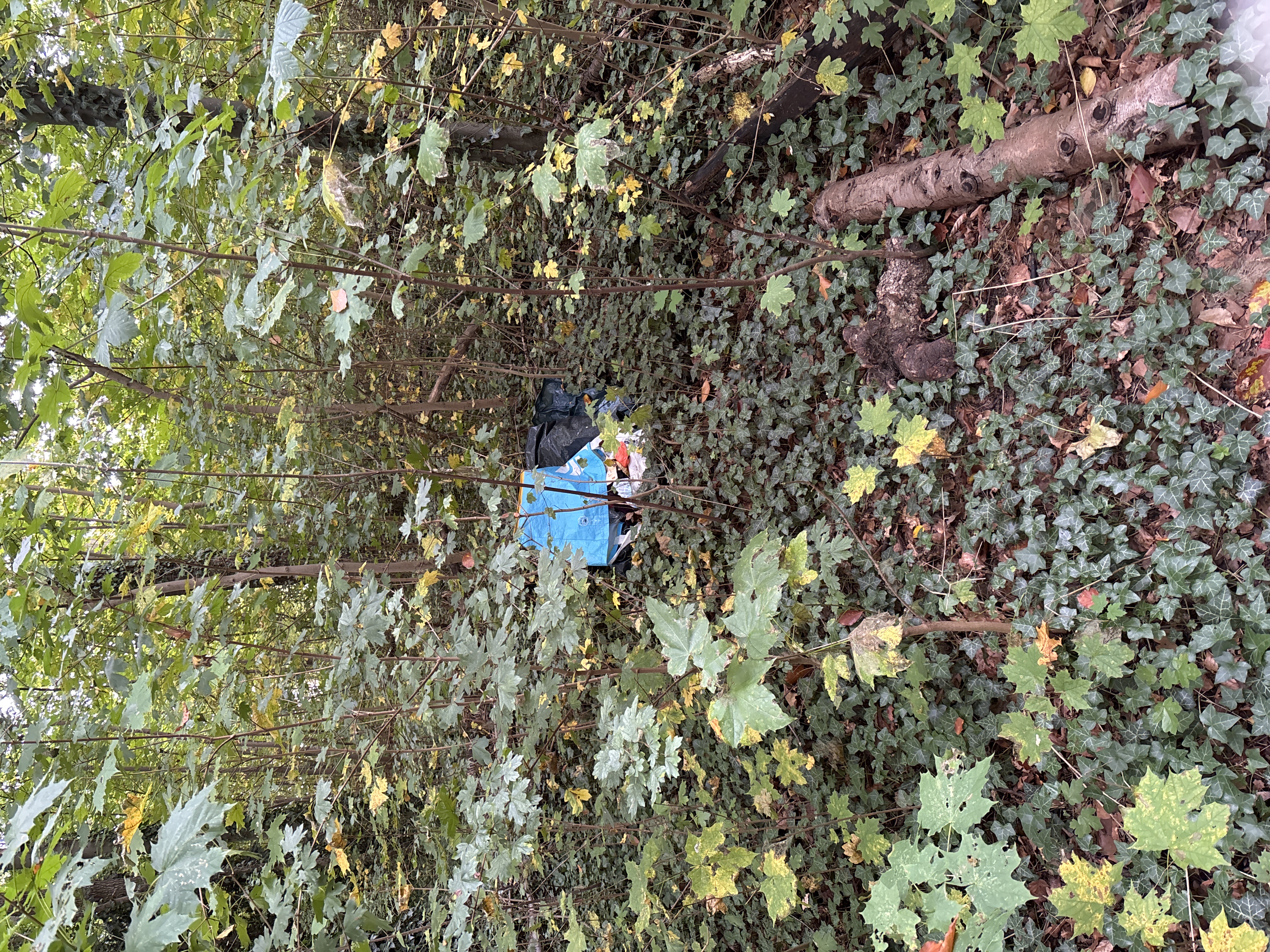 Der Müll liegt in dem kleinen Wäldchen. Wenn man den Weg in den Wald vom Lippeweg aus nimmt auf der rechten Seite.