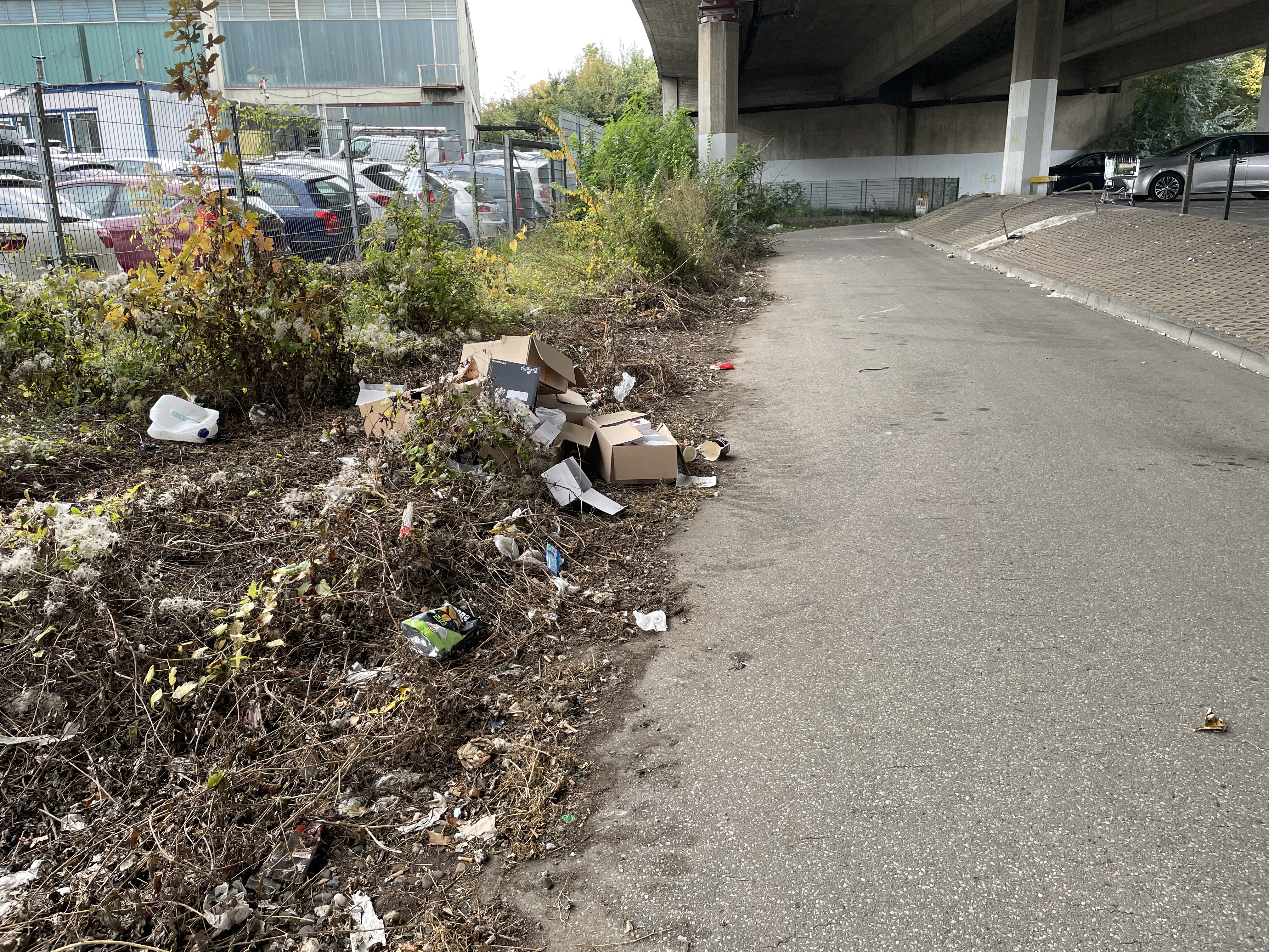 Entlang des Fußgänger- und Fahrradweges unter der Brücke der Östlichen Zubringerstraße hat sich wieder eine große Menge Müll aller Art angesammelt. Auch im weiteren Verlauf ca. 800m lang nach der Brücke sind Müllsäcke Möbelstücke und weiterer Müll großzügig im Gebüsch verteilt.