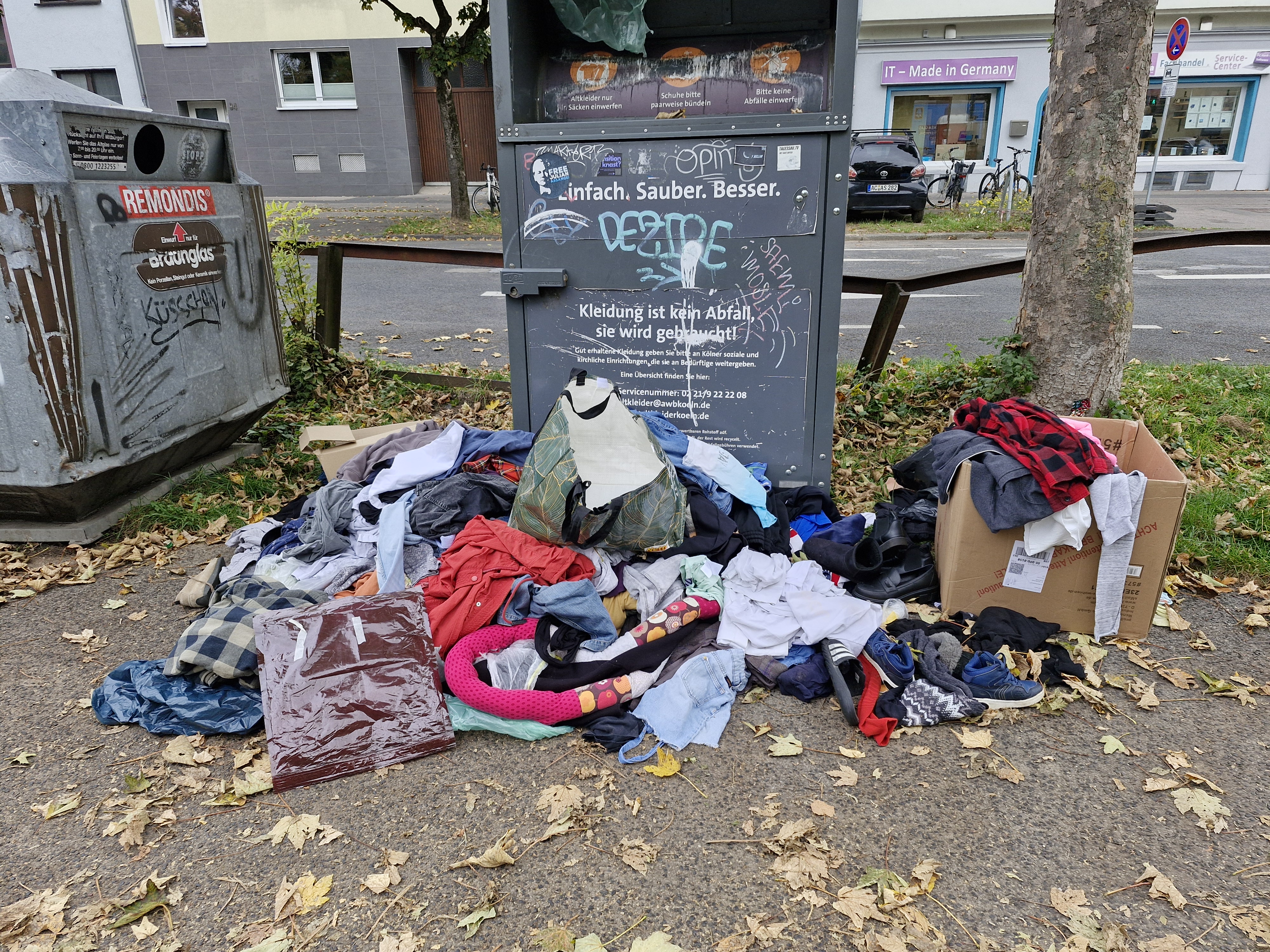 Abgeschlossen Altkleidercontainer-Standort vermüllt Rhöndorfer Str. 28 50939 Köln - Klettenberg Deutschland Statusvermerke Das Anliegen wurde erstellt. Neu Di., 14.10.2025 - 18:10 Abgeschlossen Mi., 15.10.2025 - 09:12