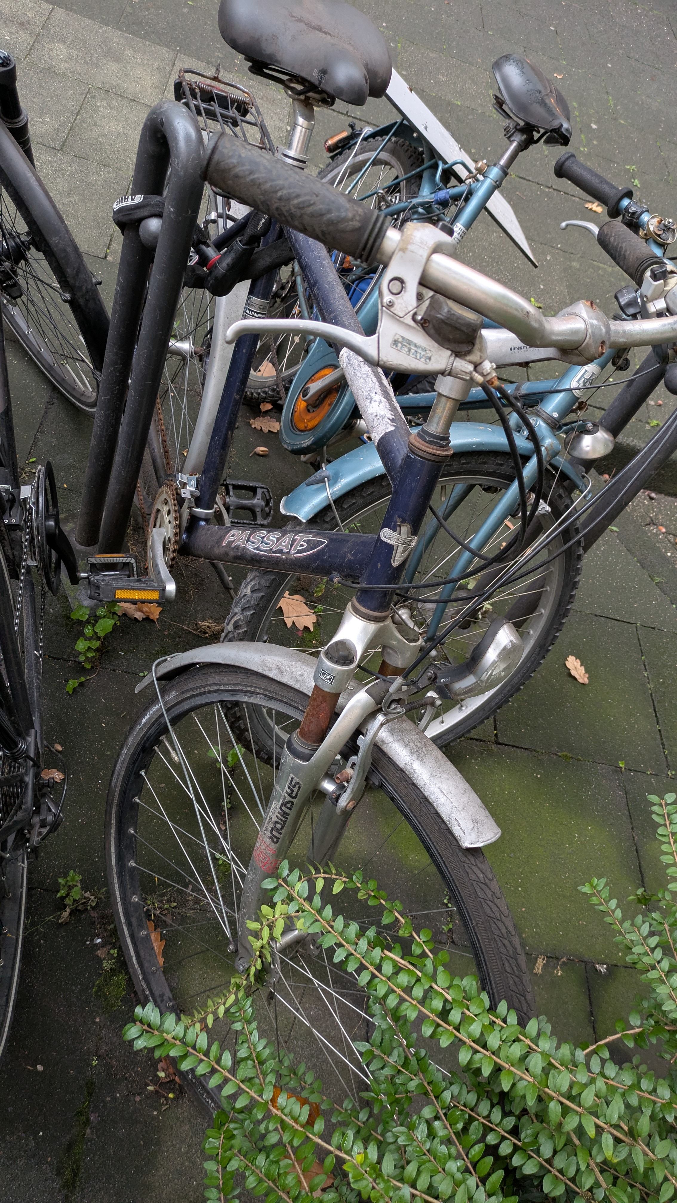 Schrottrad u. A. Verrostete Kette. Marke Passat. Hier stehen noch 3 weitere Schrotträder, die Kunden u.a. des Friseurladens die Parkplätze wegnehmen.
