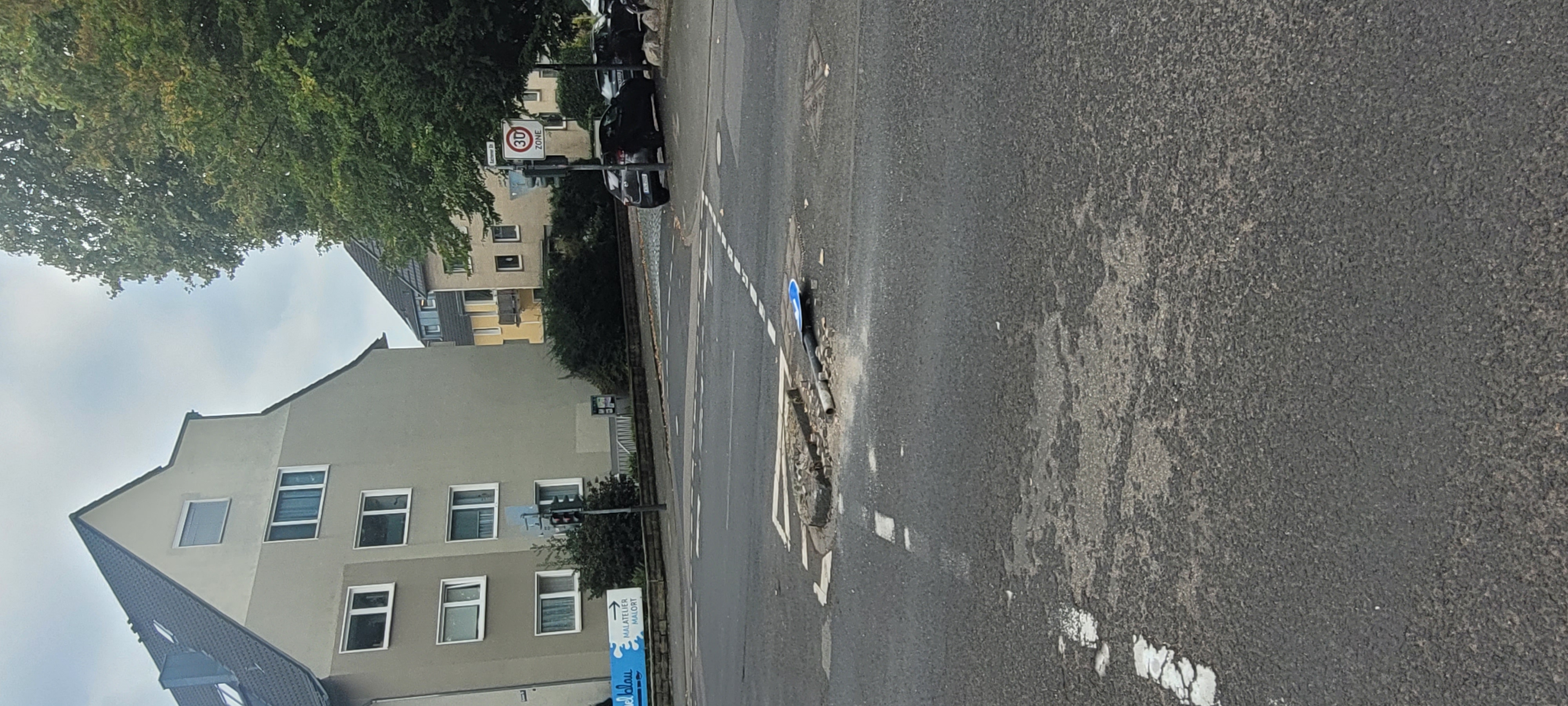 Das Verkehrszeichen auf der Kreuzung Bachemer Ecke Wilhelm-Backhaus-Str. wurde wieder mal umgefahren und liegt ungesichert auf dem Überweg.