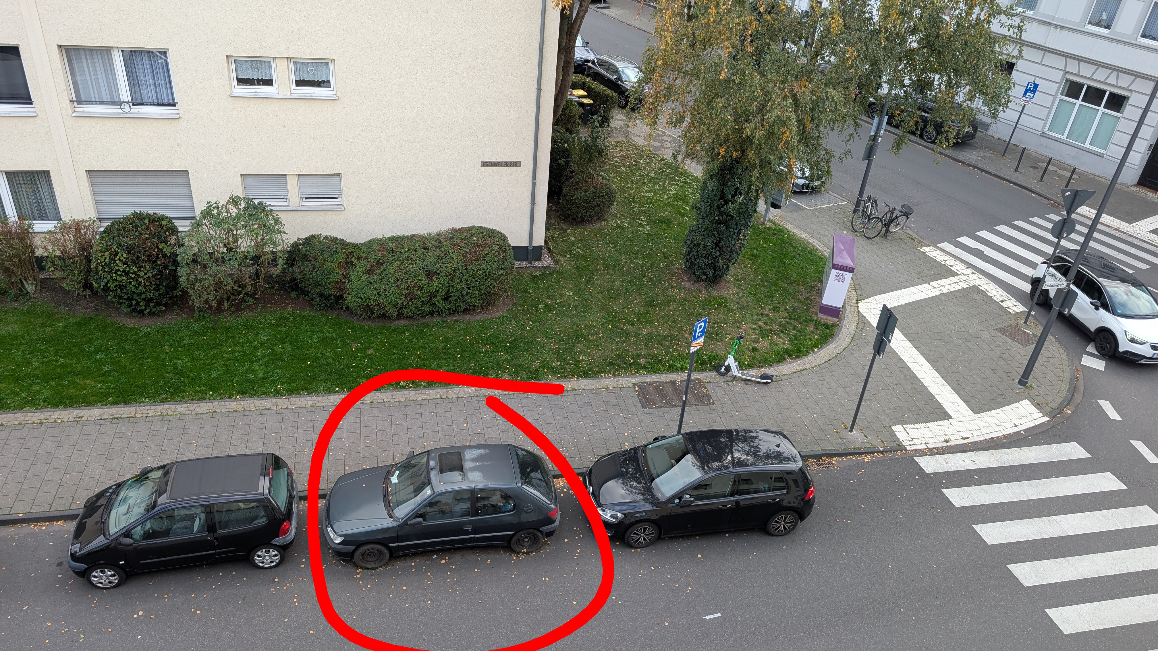 Dunkelgrüner Kleinwagen. Bekommt regelmäßig einen Zettel vom Ordnungsamt und wird dann hier in der Gegend einfach nur umgeparkt, um dann wieder monate-/Jahrelang nicht bewegt zu werden.