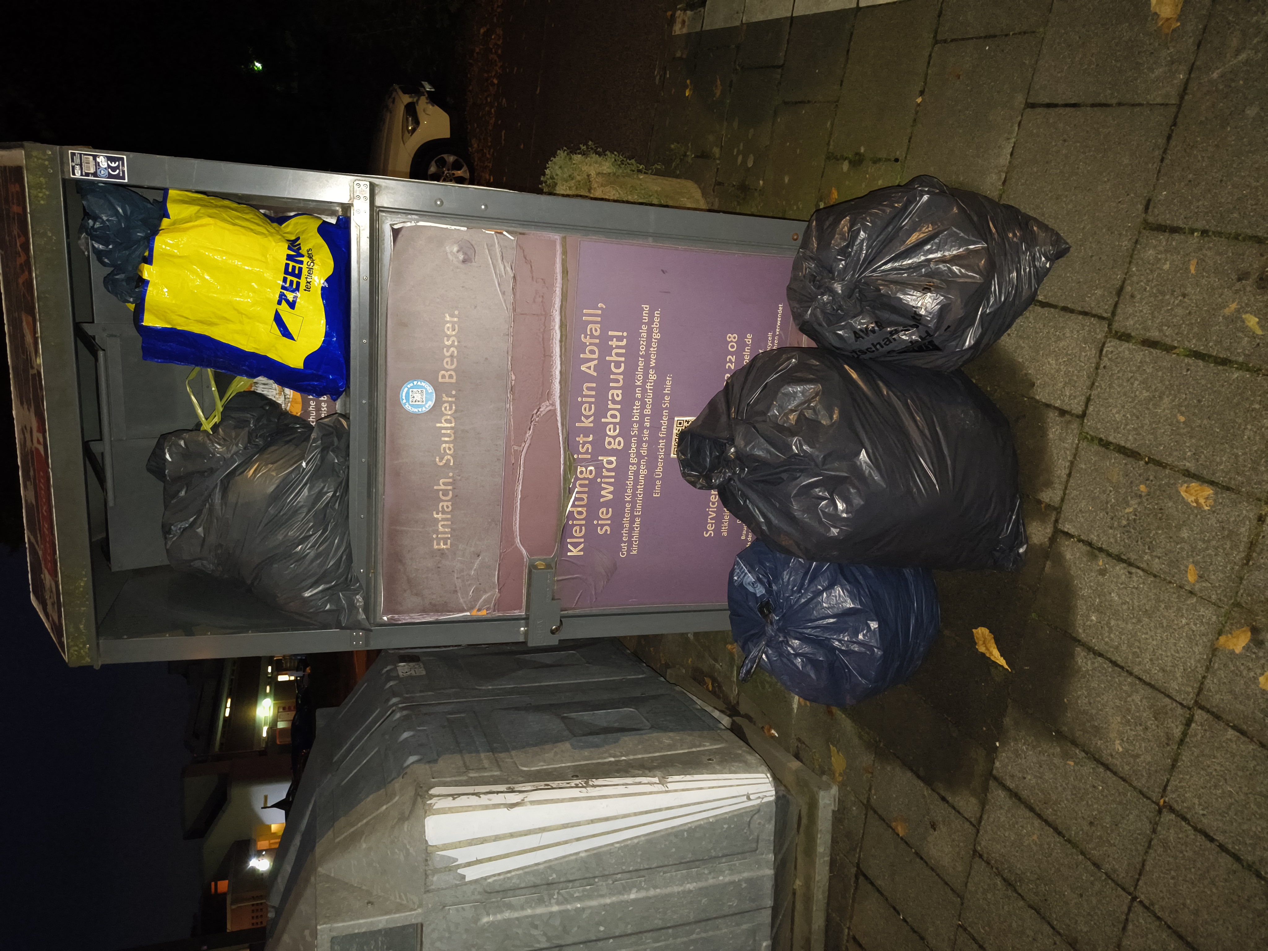 Der Kleidercontainer (Friedensstr. /Ecke Tiergartenstr. 1) wurde immer noch nicht geleert. Heute Abend (ca. 19 Uhr) habe ich die Sachen nahezu allesamt aus den Säcken herausgerissen und auf dem Gehweg verstreut vorgefunden. Ich habe mir mal wieder die Mühe gemacht, sie zurück in die Säcke gelegt und ordentlich vor dem VOLLEN Kleidercontainer abgestellt (s. Bild). Jetzt liegt es an Ihnen, den Container nach nunmehr VIER Meldungen endlich zu leeren. Danke! Mit freundlichen Grüßen