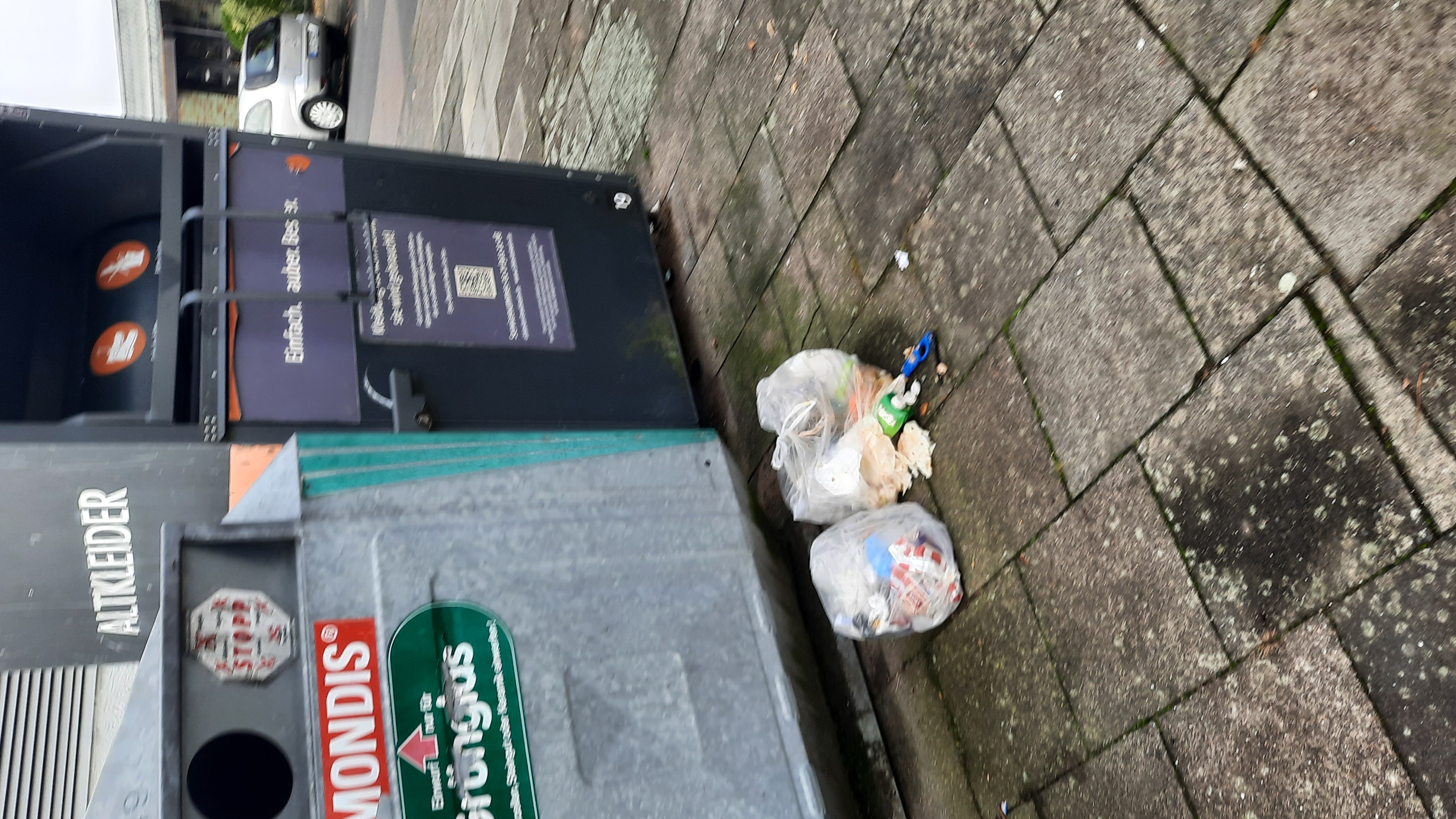 Vor dem Altglasscontainer hat jemand zwei Beutel mit Hausmüll abgelegt