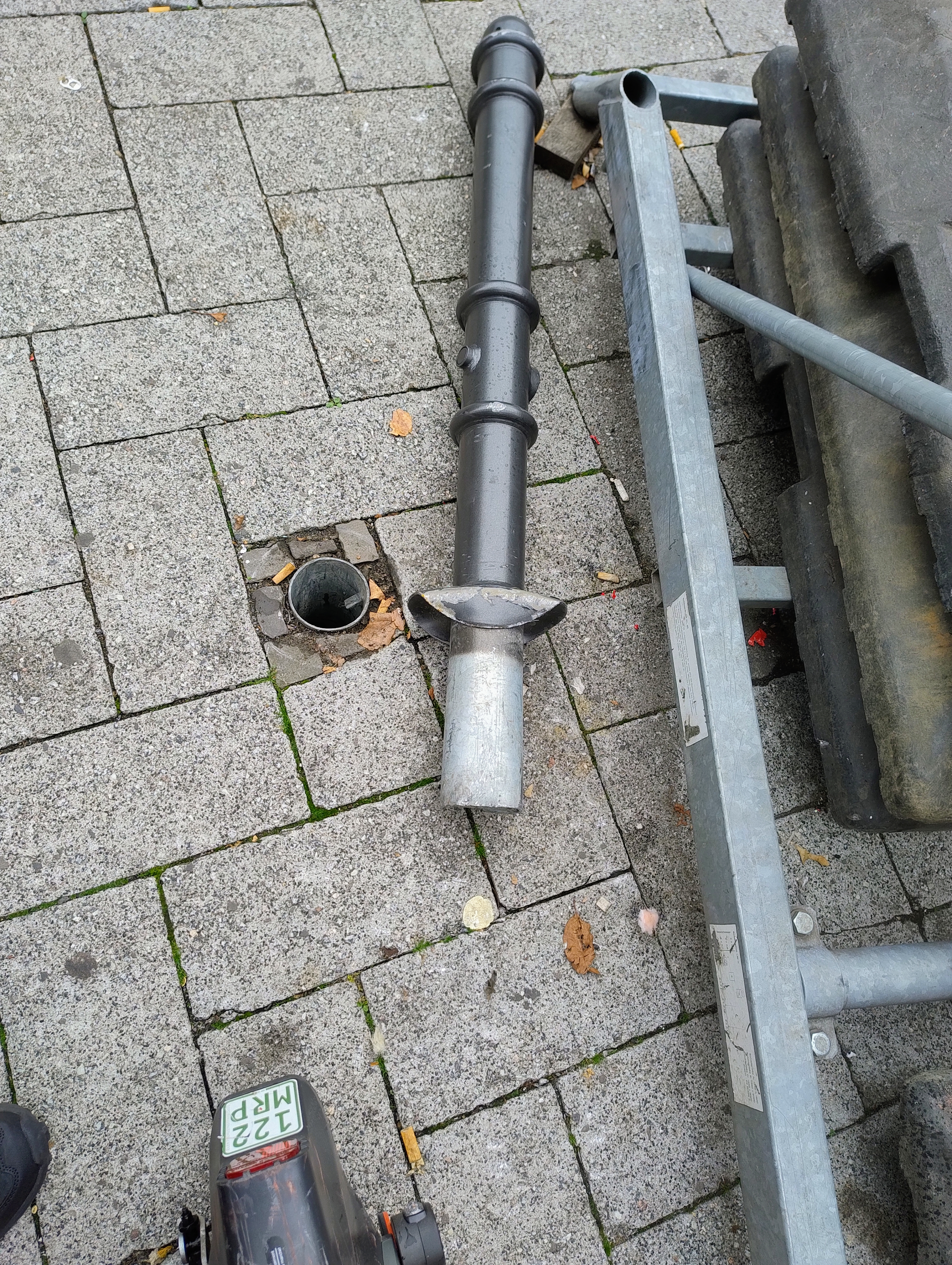 Defekter Pöller. Ersatz wäre nötig. Zur Zeit hält das Schild für die Umleitung die Straße von Pkw frei