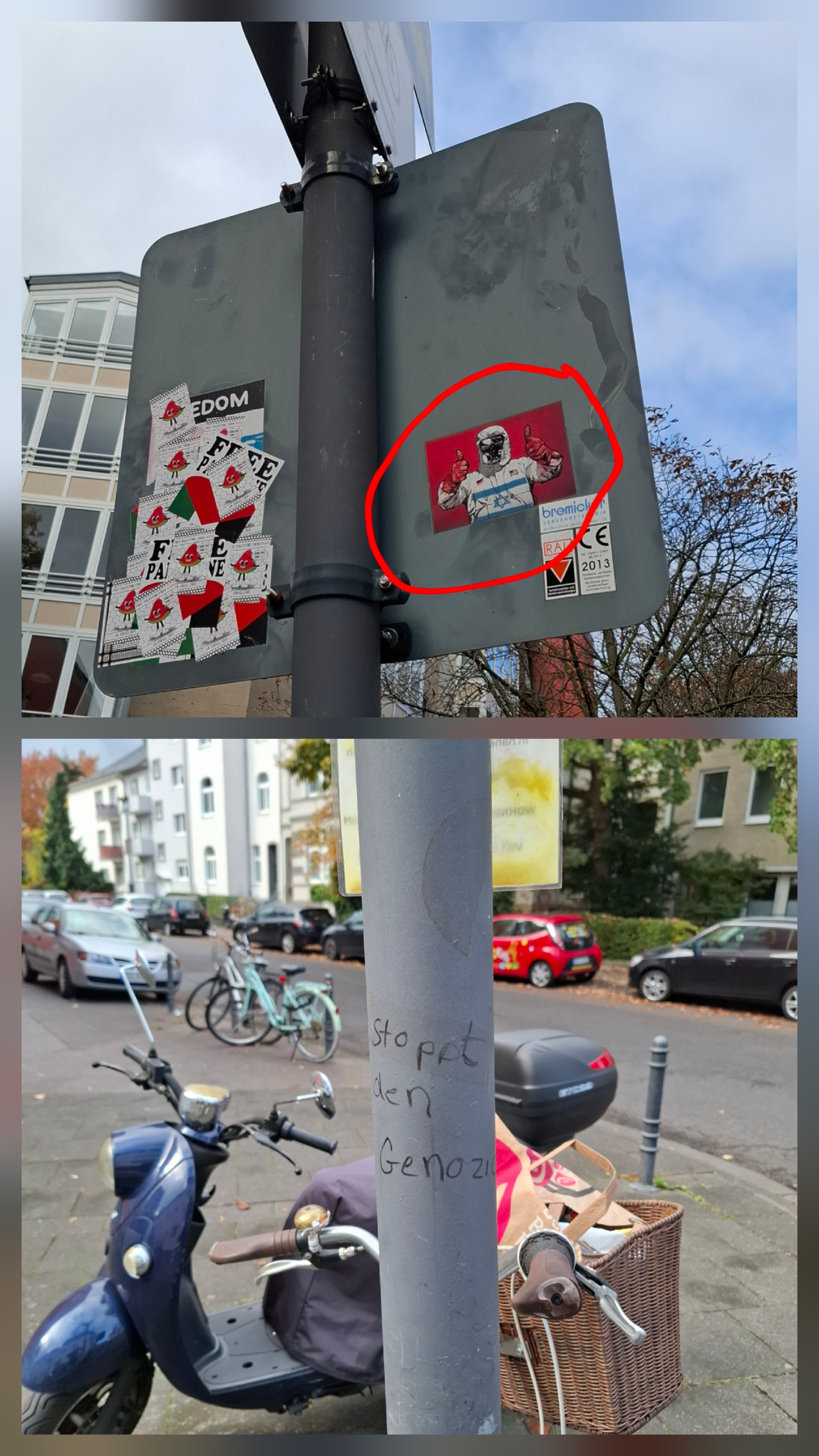 Antisemitische Verunreinigungen an einem Straßenschild (s. insbesondere den markierten Sticker rechts), bitte dringend entfernen!