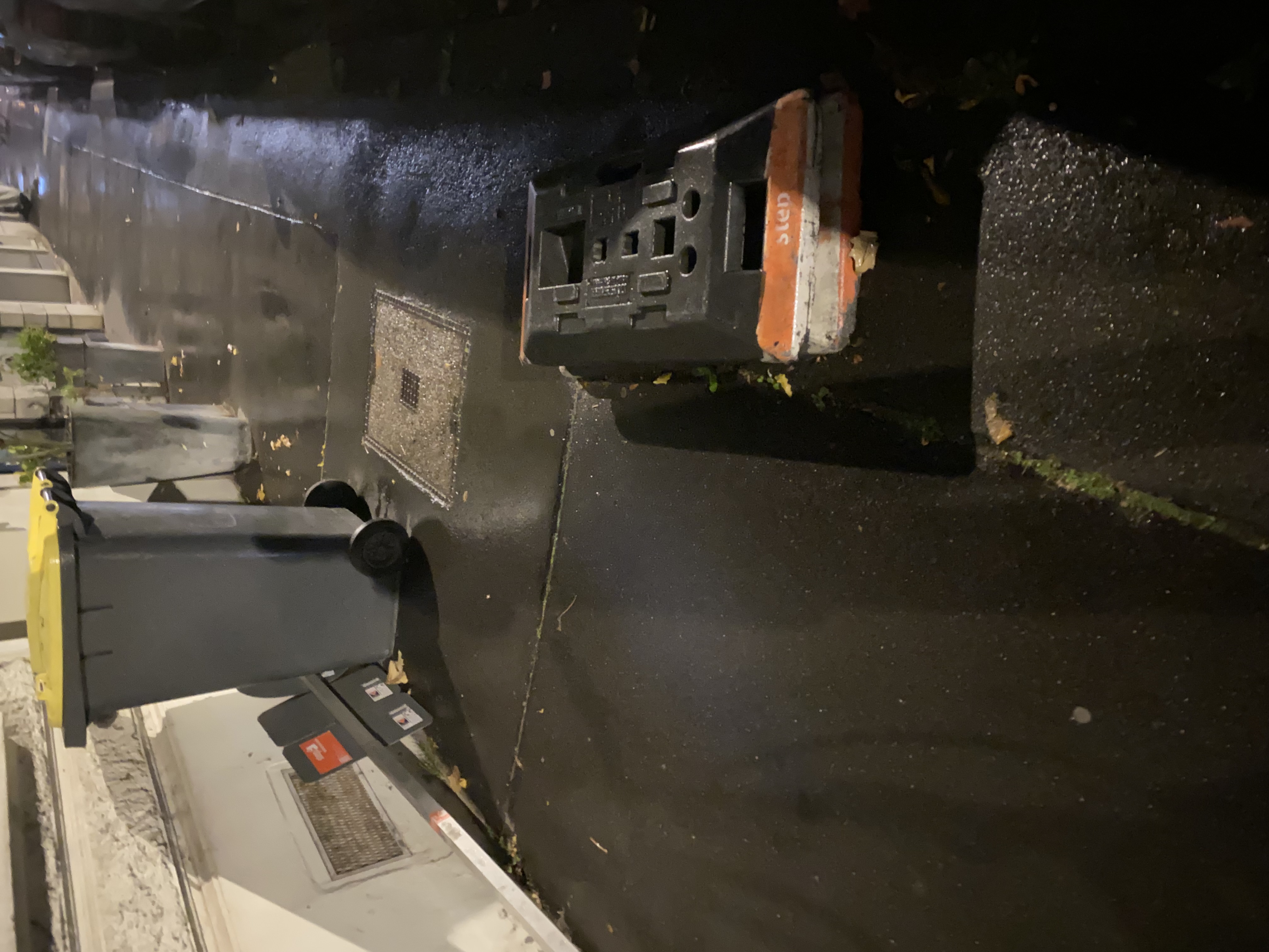 auf der gegenüberliegenden Straßenseite lehnen weiter äh Halterungen an einer Hauswand.