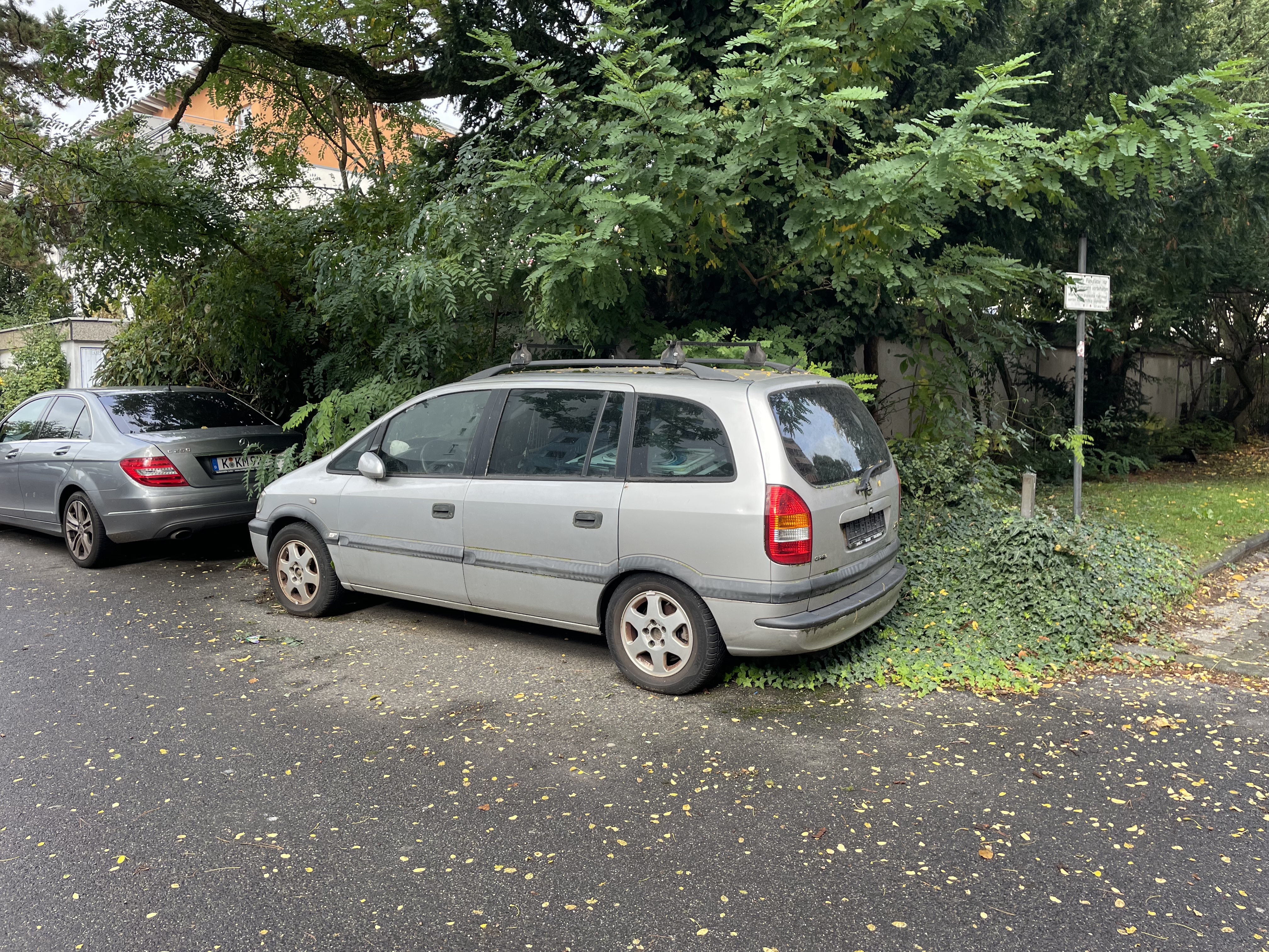 Dieser Wagen steht seit mindestens 4 Jahren an genau dieser Stelle, wird als Lagerraum genutzt und nimmt uns Anwohnern wertvolle Parkplätze weg. An den Reifen befindet sich bereits Moos.