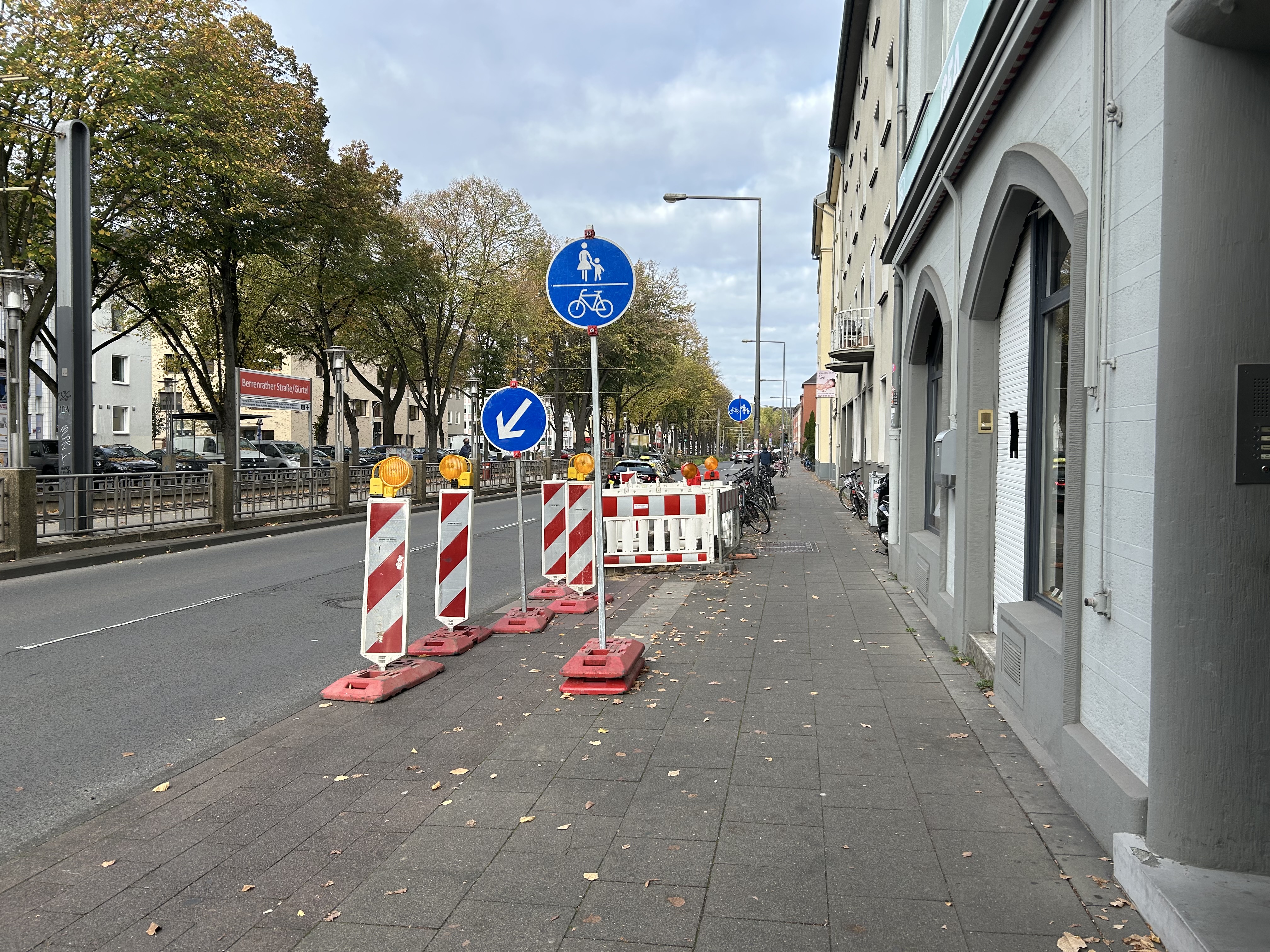 Wegen Leitungsarbeiten ist der Radweg blockiert. Statt auf der >6m breiten Fahrbahn einen temporären Radstreifen zu markieren, werden Radfahrende auf den <2m schmalen Gehweg geleitet, direkt vor einer Arztpraxis, zu der viele ältere Menschen gehen.