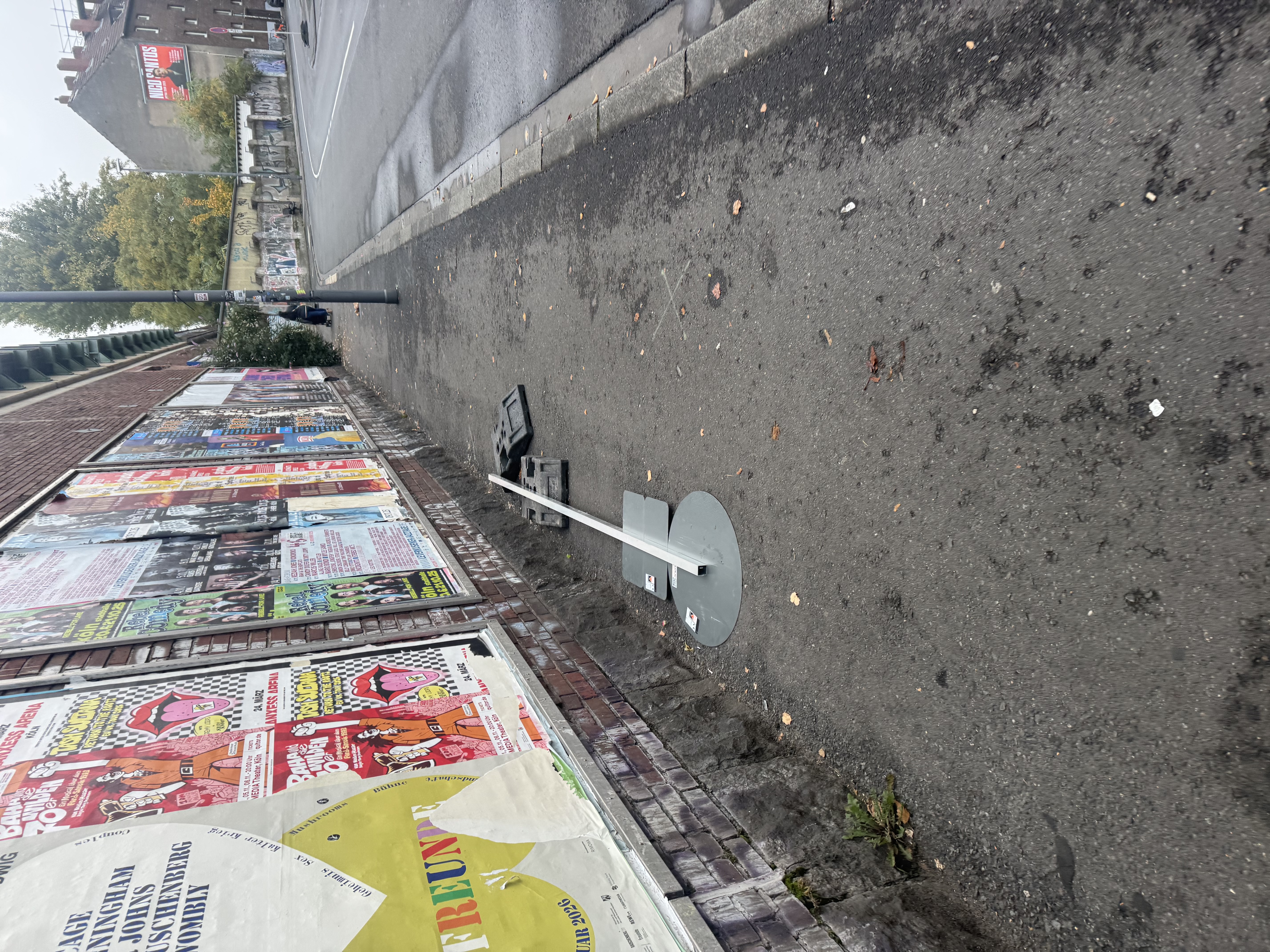 hier und auf der gegenüberliegenden Straßenseite liegen Schilder herum