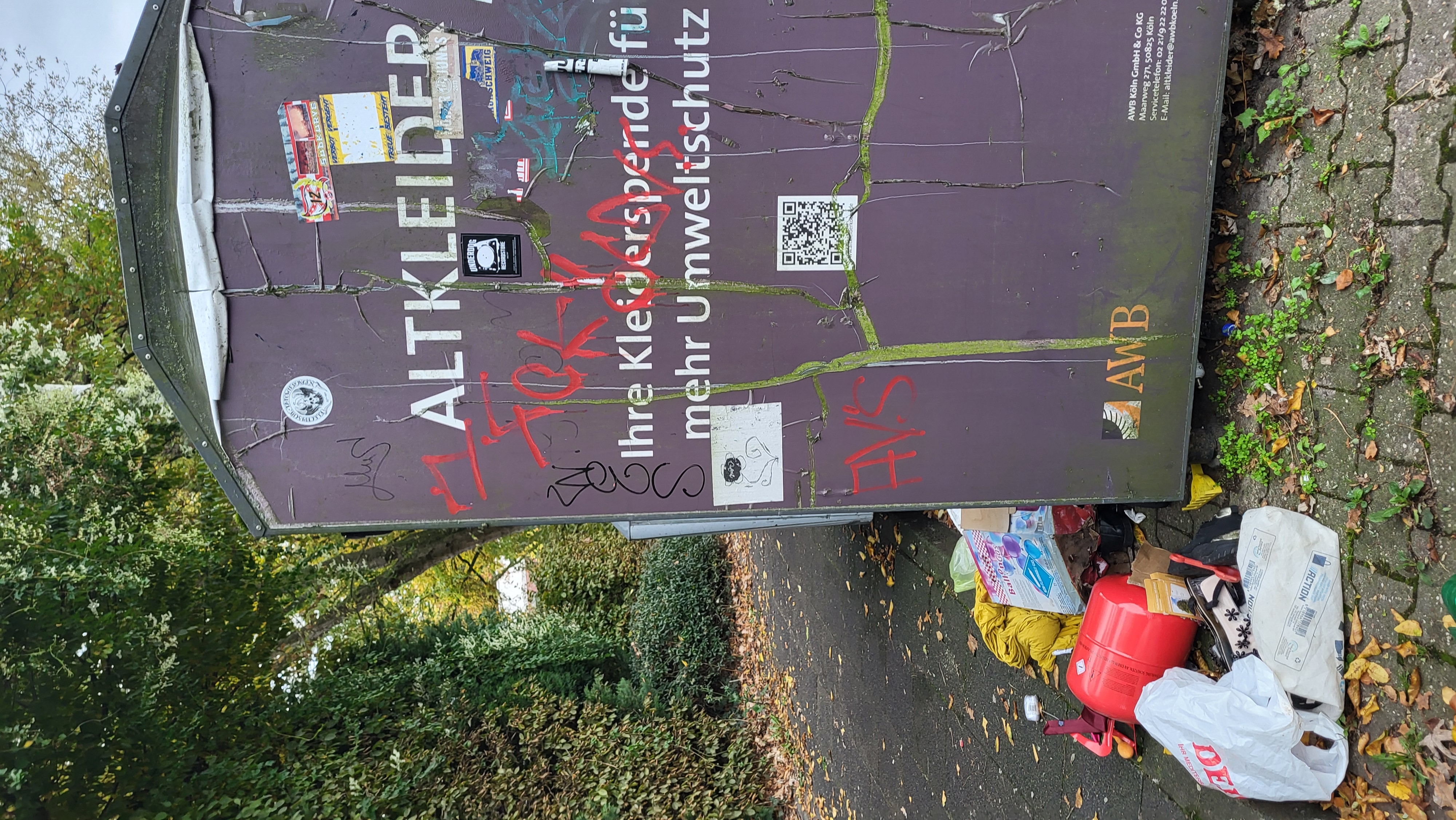 Starke Vermüllung am Altkleider Container. Gasflasche liegt hinter dem Container Neu Altkleidercontainer-Standort vermüllt Breslauer Str. 19 50858 Köln Deutschland Statusvermerke Das Anliegen wurde erstellt. Neu Sa., 18.10.2025 - 22:45